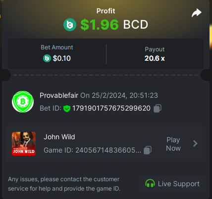 2. Bet 0.1$ - win 20.6x - link https://bc.game/#/sd/11TEI9S7O62CCB - Bet Id : 1791901757675299620
