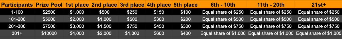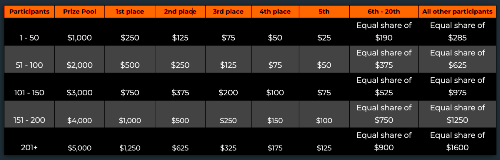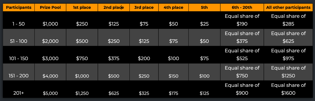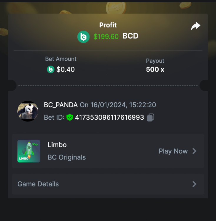 $5k Prestige Limbo Challenge #109 DURATION: 4th December - 11th December 05:30 pm UTC This weeks Prestige Challenge is back with your favourite game Limbo! Take part in this amazing yet challenging event to split prizes worth $5,000! Please check below the all new prize pool distribution table to understand more about it. We will be trying this new way for a while and depending on the participations and feedback we will further increase our pools. What's the Challenge? Win the highest multiplier you can on on BC.Game's in-house game, Limbo. If there is a tie, the player with the higher average bet amount (in USD) shall be the winner. If there is a tie in the amount and payout, the one who posted or edited his post first will be considered in the Ranking. How to Enter To enter, copy the link of the bet you'd like to submit. Once you've copied it, paste it as a reply to this thread like so: Link: https://bc.game/#/sd/11NOEOJIJDHGVJ In the same post, upload a screenshot of your win by clicking the game ID WITH VIEW IN USD mode ENABLED (accessible at the bottom of dropdown menu for your wallet up top. This way, we can ensure that your bet indeed met the minimum requirement at the time of placing it: Link: https://bc.game/#/sd/11NOEOJIJDHGVJ Minimum VIP Minimum VIP 4 with phone verified will be eligible! Minimum Payouts Minimum payout to qualify is 20x Minimum Bet Size $0.20 USD equivalent Eligible Coins All cryptocurrencies are eligible (excepting JB) Available Prizes GENERAL TERMS Please combine all of your hits together in a SINGLE post. Edit your existing post for additional hits, don't create a new post. Each eligible entry must have the Bet Slip URL, failure to include it will disqualify participation in the event. Bet Slip image is not mandatory. Bets must be posted within 24 hours of placing bet in order to keep things fair for everyone. Bets must be made during the specified time window stated above. This thread will lock automatically when the time period is over. One (1) entry per household. Anyone found attempting to win multiple prizes will be disqualified from this challenge as well as all future challenges. Failure to follow instructions will result in your submission being null and void. By entering this challenge, you acknowledge that BC.Game has the final decision on results and placement. Payouts will be distributed after the event is finished. Please note that it could take anywhere between 24 hours to 7 days after the completion of the event.