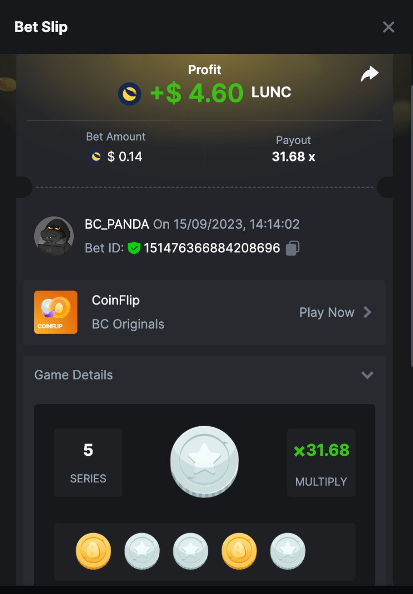 $5k Prestige Coinflip Challenge #106 DURATION: 15th SEP - 22th SEP 13:20 pm UTC Greetings, BC.Game enthusiasts! From 15th to 22nd September, step into the Coinflip Conquest Challenge! Whether you're a seasoned flipper or a newcomer, showcase your knack for hitting that 31.68x multiplier across 5 flips. A hefty $5,000 prize pool awaits. Flip wisely, target the leaderboard, and let fortune favor your coin's landing! What's the Challenge? Win the highest multiplier you can on in-house Coinflip (Most flips in a row). If there is a tie, the player with the higher average bet amount (in USD) shall be the winner. If there is a tie in the amount and payout, the one who posted or edited his post first will be considered in the Ranking. How to Enter To enter, copy the link of the bet you'd like to submit. Once you've copied it, paste it as a reply to this thread like so: Link: https://bc.game/#/sd/11I5M1390NB8QV In the same post, upload a screenshot of your win by clicking the game ID WITH VIEW IN USD mode ENABLED (accessible at the bottom of dropdown menu for your wallet up top. This way, we can ensure that your bet indeed met the minimum requirement at the time of placing it: Link: https://bc.game/#/sd/11I5M1390NB8QV Minimum VIP Minimum VIP 4 with phone verified will be eligible! Minimum Payouts Minimum payout to qualify is 31.68x (5 Flips) Minimum Bet Size $0.15 USD equivalent Eligible Coins All cryptocurrencies are eligible (excepting JB) Available Prizes GENERAL TERMS Please combine all of your hits together in a SINGLE post. Edit your existing post for additional hits, don't create a new post. Each eligible entry must have the Bet Slip URL, failure to include it will disqualify participation in the event. Bet Slip image is not mandatory. Bets must be posted within 24 hours of placing bet in order to keep things fair for everyone. Bets must be made during the specified time window stated above. This thread will lock automatically when the time period is over. One (1) entry per household. Anyone found attempting to win multiple prizes will be disqualified from this challenge as well as all future challenges. Failure to follow instructions will result in your submission being null and void. By entering this challenge, you acknowledge that BC.Game has the final decision on results and placement. Payouts will be distributed after the event is finished. Please note that it could take anywhere between 24 hours to 7 days after the completion of the event.