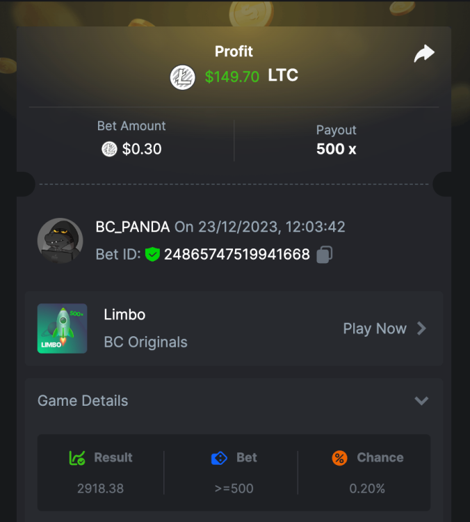 $10k HOLIDAY SPECIAL PRESTIGE CHALLENGE DURATION: 23rd December – 2nd January, 08:30 am UTC Celebrate the festive season with BC.GAME's "Christmas & New Year Special Prestige Challenge"! Dive into the holiday spirit with our exciting lineup of games: Crash, Limbo, Hash Dice, and Classic Dice. This special event is your chance to end the year on a high note and ring in the new year with spectacular wins! Join us on a festive gaming spree where the excitement never ends. Challenge yourself in any of our four featured games and aim for the highest multipliers. It's a holiday extravaganza with a competitive twist! What's the Challenge? Achieve the highest multiplier possible in our exclusive games: Crash | Limbo | Classic Dice | Hash Dice In the event of a tie, the winner will be determined by the higher average bet amount (in USD). Should there be a tie in both the amount and payout, priority in the ranking will be given to the player who first posted or edited their entry. How to Enter To enter, copy the link to the bet you'd like to submit. Once you've copied it, paste it as a reply to this thread, like so: Link: https://bc.game/#/sd/11OYP94GH5IXXJ In the same post, upload a screenshot of your win by clicking the game ID WITH VIEW IN USD mode ENABLED (accessible at the bottom of the drop-down menu for your wallet up top). This way, we can ensure that your bet indeed meets the minimum requirement at the time of placing it: Minimum VIP A minimum of Level VIP 4 with phone verified will be eligible! Minimum Payouts The minimum payout to qualify is 20x Minimum Bet Size $0.30 USD equivalent Eligible Coins All cryptocurrencies are eligible (excepting JB) Available Prizes GENERAL TERMS Please combine all of your hits into a single post. Edit your existing post for additional hits; don't create a new post. Each eligible entry must have the Bet Slip URL; failure to include it will disqualify participation in the event. The Bet Slip image is not mandatory. Bets must be posted within 24 hours of placing the bet in order to keep things fair for everyone. Bets must be made during the specified time window stated above. This thread will lock automatically when the time period is over. One (1) entry per household. Anyone found attempting to win multiple prizes will be disqualified from this challenge as well as all future challenges. Failure to follow the instructions will result in your submission being null and void. By entering this challenge, you acknowledge that BC.Game has the final say on results and placement. Payouts will be distributed after the event is finished. Please note that it could take anywhere from 24 hours to 7 days after the completion of the event.