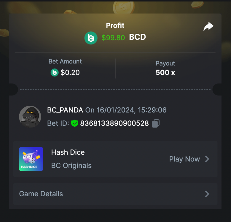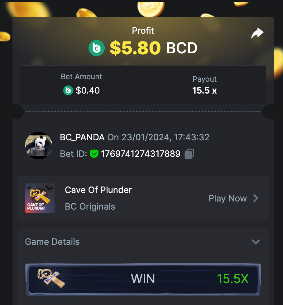 $5,000 EXCLUSIVE PRESTIGE CHALLENGE #111 DURATION: 23rd JAN - 30th JAN 14:30 UTC Get ready for the Prestige Challenge featuring the highly anticipated game CAVE OF PLUNDER! Dive into this thrilling event from January 23 to January 30, ending at 14:30 UTC, and compete for a share of the $5,000 prize pool. Make sure to check all the terms to learn how you can be a part of this exciting challenge. Wishing you the best of luck! What's the Challenge? Capture a multiplier - 15.5x or higher on the Cave of Plunder Game. Make sure you get your multiplier captured on my bets section. In case of a tie in multipliers, ranking is based on higher average bet amounts (USD). If still tied, the first to post or edit their entry will be prioritized in the ranking. How to Enter To enter, copy the link of the bet you'd like to submit. Once you've copied it, paste it as a reply to this thread like so: Link: https://bc.game/#/sd/11R44BMJQJ0TI3 In the same post, upload a screenshot of your win by clicking the game ID WITH VIEW IN USD mode ENABLED (accessible at the bottom of dropdown menu for your wallet up top. This way, we can ensure that your bet indeed met the minimum requirement at the time of placing it: Link: https://bc.game/#/sd/11R44BMJQJ0TI3 Minimum VIP Minimum VIP 4 with phone verified will be eligible! Minimum Payouts The minimum payout to qualify is 15.5x Minimum Bet Size $0.4 USD equivalent Eligible Coins All cryptocurrencies are eligible (excepting JB) Available Prizes GENERAL TERMS Please combine all of your hits into a single post. Edit your existing post for additional hits; don't create a new post. Each eligible entry must have the Bet Slip URL; failure to include it will disqualify participation in the event. The Bet Slip image is not mandatory. Bets must be posted within 24 hours of placing the bet in order to keep things fair for everyone. Bets must be made during the specified time window stated above. This thread will lock automatically when the time period is over. One (1) entry per household. Anyone found attempting to win multiple prizes will be disqualified from this challenge as well as all future challenges. Failure to follow the instructions will result in your submission being null and void. By entering this challenge, you acknowledge that BC.Game has the final say on results and placement. Payouts will be distributed after the event is finished. Please note that it could take anywhere between 3 to 7 days after the completion of the event.