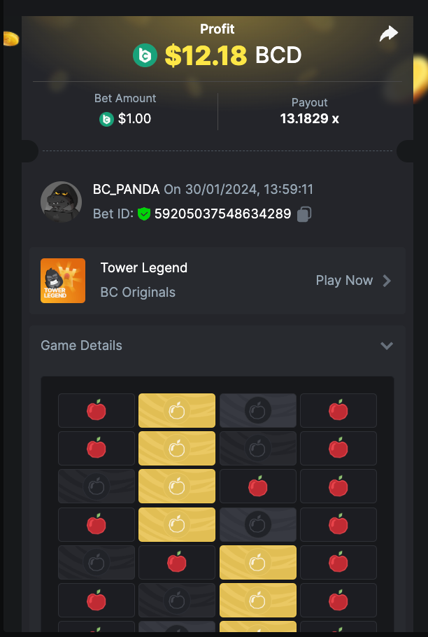 $5k Prestige Tower Legend Challenge #112 DURATION: 30th JAN - 6th FEB 14:30 UTC Attention VIPs! It's time to gear up and sprint to the pinnacle of each tower to claim your piece of this week's exhilarating prize pool! Join the rush from January 30 to February 6, ending at 14:30 UTC, and vie for a slice of the $5,000 prize bounty. Don't miss out; familiarize yourself with all the rules to fully engage in this electrifying challenge. Get ready to show your skills, and may luck be in your favor! Let's go, champions! WHAT IS THE CHALLENGE? Get to the top of the tower on any difficulty level at In-House Tower Legend. The player who gets to the top on the most levels will be the winner. If there's a tie, the player with the higher average bet amount (in USD) shall be the winner. If there is a tie in the amount and payout, the one who posted or edited his post first will be considered in the ranking. HOW TO ENTER To enter, copy the link of the bet you'd like to submit. Once you've copied it, paste it as a reply to this thread like so: Link: https://bc.game/#/sd/11RL29Q587Z1GZ In the same post, upload a screenshot of your win by clicking the game ID WITH VIEW IN USD mode ENABLED (accessible at the bottom of dropdown menu for your wallet up top. This way, we can ensure that your bet indeed met the minimum requirement at the time of placing it: LINK: https://bc.game/#/sd/11RL29Q587Z1GZ MINIMUM LEVEL Minimum VIP 8 with phone verified will be eligible! MINIMUM REQUIREMENTS Get to the top of 1 tower on any difficulty level. MINIMUM BET AMOUNT Min bet Easy - $ 1 USD equivalent Min bet Medium - $ 0.50 USD equivalent Min bet Hard - $ 0.20 USD equivalent Min bet Extreme - $ 0.10 USD equivalent Min bet Nightmare - $ 0.05 USD equivalent ELIGIBLE COINS All cryptocurrencies are eligible (excepting JB) AVAILABLE PRIZES GENERAL TERMS Please combine all of your hits into a single post. Edit your existing post for additional hits; don't create a new post. Each eligible entry must have the Bet Slip URL; failure to include it will disqualify participation in the event. The Bet Slip image is not mandatory. Bets must be posted within 24 hours of placing the bet in order to keep things fair for everyone. Bets must be made during the specified time window stated above. This thread will lock automatically when the time period is over. One (1) entry per household. Anyone found attempting to win multiple prizes will be disqualified from this challenge as well as all future challenges. Failure to follow the instructions will result in your submission being null and void. By entering this challenge, you acknowledge that BC.Game has the final say on results and placement. Payouts will be distributed after the event is finished. Please note that it could take anywhere between 3 to 7 days after the completion of the event.