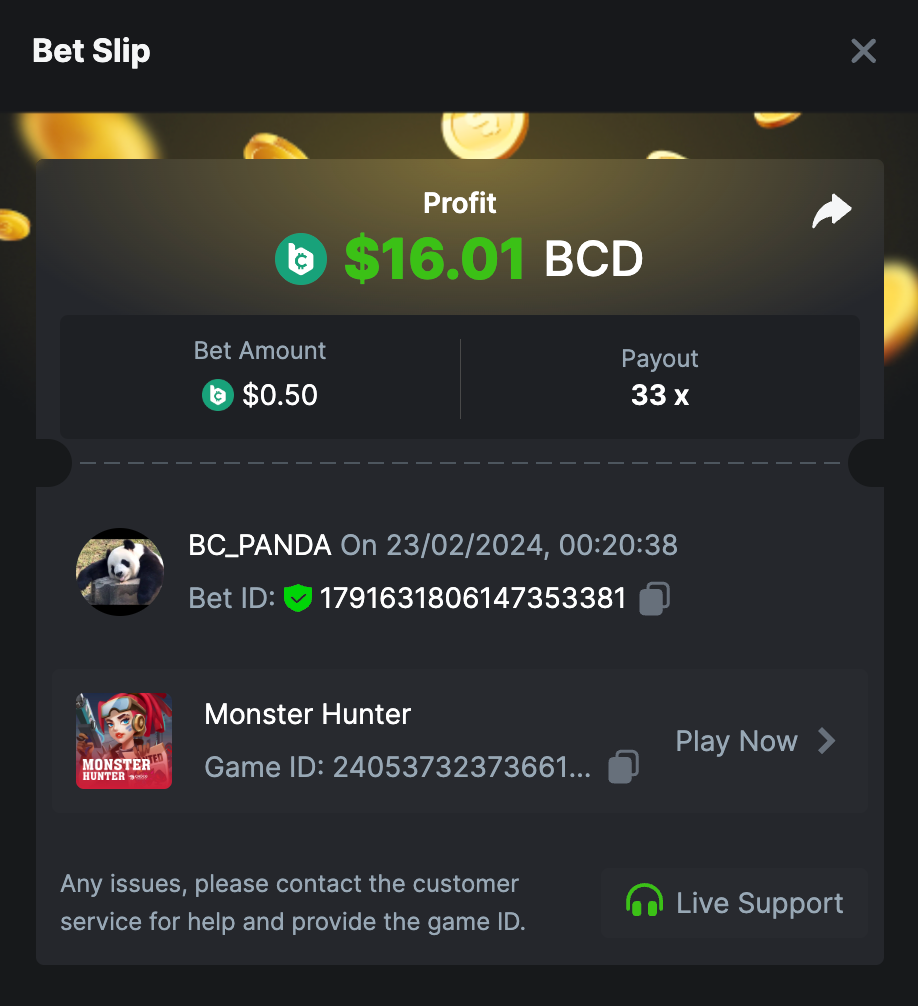 $5,000 BC Originals' New Slots Challenge DURATION: 23rd FEB - 1st MAR, 09:30 am UTC Attention VIPs! Get set for our latest excitement: Dive into the new slot game additions in BC Originals. Gear up for colossal multipliers and seize the opportunity to land hefty payouts with each spin. Join the action now and experience the exhilarating rush of big wins! What's the challenge? Capture a multiplier of 15x or higher on our BC Original slots mentioned below. Make sure you get your multiplier captured in my bets section. In the case of a tie in multipliers, ranking is based on higher average bet amounts (USD). If still tied, the first to post or edit their entry will be prioritized in the ranking. How to Enter To enter, copy the link to the bet you'd like to submit. Once you've copied it, paste it as a reply to this thread like so: Link: https://bc.game/#/sd/11T8H89NPFEOR3 In the same post, upload a screenshot of your win by clicking the game ID WITH VIEW IN USD mode ENABLED (accessible at the bottom of the drop-down menu for your wallet up top). This way, we can ensure that your bet indeed meets the minimum requirement at the time of placing it: Link: https://bc.game/#/sd/11T8H89NPFEOR3 Minimum VIP Minimum VIP 8 with phone verified will be eligible! Minimum Payouts The minimum payout to qualify is 15x Minimum Bet Size Run Away! Zombies: $0.1 Deadliest Sea: $0.1 John Wild: $0.1 Dragon Quest: $0.1 Wizard's Academy: $0.1 Doggy Miner: $0.5 Dragon Slayer: $0.5 Monster Hunter: $0.5 Eligible Coins All cryptocurrencies are eligible (excepting JB) Available Prizes GENERAL TERMS Please combine all of your hits into a single post. Edit your existing post for additional hits; don't create a new post. Each eligible entry must have the Bet Slip URL; failure to include it will disqualify participation in the event. The Bet Slip image is not mandatory. Bets must be posted within 24 hours of placing the bet in order to keep things fair for everyone. Bets must be made during the specified time window stated above. This thread will lock automatically when the time period is over. One (1) entry per household. Anyone found attempting to win multiple prizes will be disqualified from this challenge as well as all future challenges. Failure to follow the instructions will result in your submission being null and void. By entering this challenge, you acknowledge that BC.Game has the final say on results and placement. Payouts will be distributed after the event is finished. Please note that it could take anywhere between 3 to 7 days after the completion of the event.