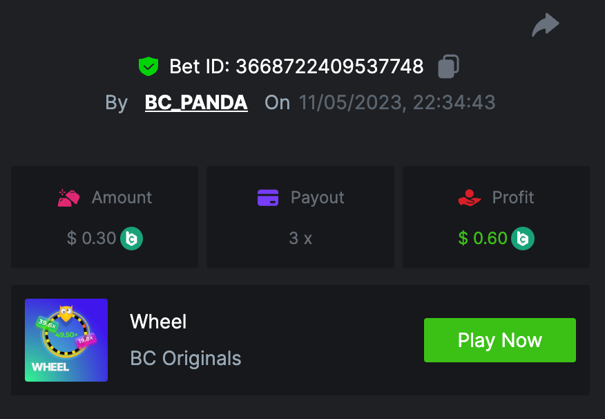 $5k Prestige Wheel Challenge #88 DURATION: 12th MAY - 19th MAY 09:00 am UTC Hello dear VIPs! This week we are hosting the Prestige challenge with our Favourite Wheel game! Take part in this amazing yet challenging event to split prizes worth $5,000! Duration of this challenge will be from 12th MAY - 19th MAY 09:00 UTC. Don't forget to read all terms below to find out how to participate in this event. Good Luck! What's the Challenge? Participants must win as many consecutive bets as possible by hitting the colour Orange or Purple (On in-house Wheel game). Consecutive bets must be of the same colour to validate the entry. Any selected Risk and Segment are valid which has these colours. Rank will be determined by the largest amount of consecutive bets, the longest sequence will be in 1st place and successively. In the event of a tie, the advantage will be given to the highest average bet in dollars. In the event of a tie again, the first bet placed will have the advantage. How to Enter To enter, copy the link of the bet you'd like to submit. Once you've copied it, paste it as a reply to this thread like so: Link: https://bc.game/#/sd/119FRYCHYZ6SYB In the same post, upload a screenshot of your win by clicking the game ID WITH VIEW IN USD mode ENABLED (accessible at the bottom of dropdown menu for your wallet up top. This way, we can ensure that your bet indeed met the minimum requirement at the time of placing it: Link: https://bc.game/#/sd/119FRYCHYZ6SYB Minimum VIP Tier Minimum VIP 4 with phone verified will be eligible! Minimum Bets Win at least 3 consecutive bets to qualify, hitting one of the 2 colours mentioned above (Consecutive wins must be the same colour). Minimum Bet Size $0.30 USD equivalent Eligible Coins All cryptocurrencies are eligible (excepting JB) Available Prizes GENERAL TERMS Please combine all of your hits together in a SINGLE post. Edit your existing post for additional hits, don't create a new post. Bets must be posted within 24 hours of placing bet in order to keep things fair for everyone. Bets must be made during the specified time window stated above. This thread will lock automatically when the time period is over. One (1) entry per household. Anyone found attempting to win multiple prizes will be disqualified from this challenge as well as all future challenges. Failure to follow instructions will result in your submission being null and void. By entering this challenge, you acknowledge that BC.Game has the final decision on results and placement. Payouts will be distributed after the event is finished. Please note that it could take anywhere between 24 hours to 7 days after the completion of the event.