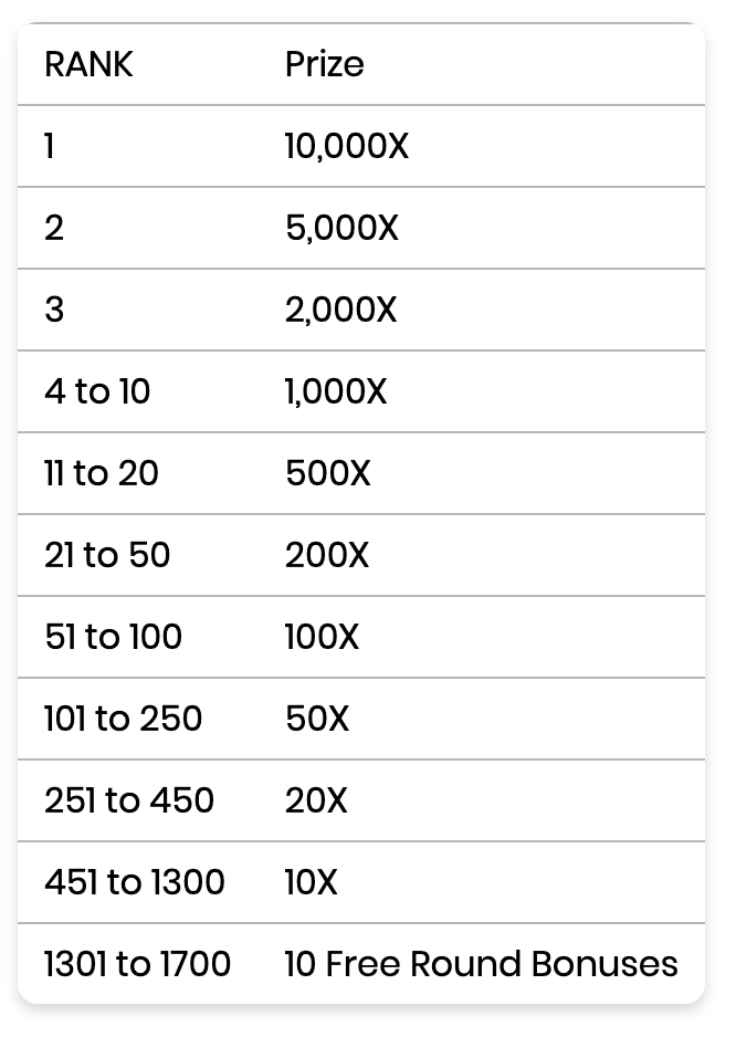 DROPS & WINS Duration: 8th February 2023 19:01 - 3rd May 2023 18:59 Prize Pool: $1,000,000/per month Drops & Wins Daly Prize Drops and Weekly Tournaments, a player’s favorite will continue to boost the gaming experience in some of the most popular video slot games on the market. Between 8th February and 3rd May 2023, we are committed to giving out $1,000,000 monthly in the form of cash, multiplier, and Free Round Bonuses as prizes. Check below the terms and conditions of this tournament and prize distributions. Drops & Wins (Slots) Participating games Wolf Gold™, Mustang Gold™, Sweet Bonanza™, John Hunter and the Tomb of the Scarab Queen™, Great Rhino Megaways™, John Hunter and the Book of Tut™, The Dog House™, The Dog House Megaways™, Chilli Heat™, Fruit Party™, Big Bass Bonanza™, Madame Destiny Megaways™, Gems Bonanza™, Wild Wild Riches™, Wild West Gold™, Gates of Olympus™, Power of Thor Megaways™, Floating Dragon Hold&Spin™, The Hand of Midas™, Buffalo King Megaways™, Juicy Fruits™, Bigger Bass Bonanza™, Starlight Princess™, Joker’s Jewels™, Big Bass Bonanza Megaways™, Book of The Fallen™, 5 Lions Megaways™, Buffalo King™, Cleocatra, Extra Juicy Megaways™, Wild West Gold Megaways, Big Bass Splash, Sugar Rush, Book of Golden Sands, Floating Dragon Megaways, Big Bass – Keeping it Reel™, Release the Kraken 2™, Fury of Odin Megaways™, Hot Pepper™, PIZZA! PIZZA? PIZZA!™, Sweet Powernudge™, Pinup Girls, Secret City Gold, Mammoth Gold Megaways, Fish Eye, Monster Superlanche, Fire Archer Eligible Games from 8th FEB 2023 19:01 CET to 3rd May 2023 18:59 CEST, from time to time the provider will update the list and we will update this forum with new list. Drops & Wins (Live Casino) Participating games Daily Prize Drops: Auto-Roulette 1 (ID – 225), Roulette 1 – Azure (ID – 227), Roulette 2 (ID – 201), Roulette 3 – Macao (ID – 206), Roulette 4 – Russian (ID – 221), Roulette 5 – German (ID – 222), Roulette 6 – Turkish (ID – 224), Roulette 7 – Italian (ID – 223), Roulette 8 – Indian (ID – 229), Roulette 9 – The Club (ID – 545), Roulette 11 – Dutch (ID – 235), Roulette 12 – Romanian (ID – 233), Roulette 14 – Spanish (ID – 234), Speed Roulette 1 (ID – 203), Speed Roulette 2 (ID – 205), Roulette 10 – Ruby (ID – 230), Mega Roulette (ID – 204), Sweet Bonanza Candyland (ID – 1101), Mega Wheel (ID – 801), Boom City (ID – 1401), Power UP Roulette (ID – 240), Roulette 15 – Flemish (ID – 241) plus dedicated tables Weekly Blackjack Tournament: Blackjack 10 – Azure (ID – 517), Blackjack 22 – Azure (ID – 526), Blackjack 23 – Azure (ID – 527), Blackjack 24 – Azure (ID – 528), Blackjack 25 – Azure (ID – 529), Blackjack 26 – Azure (ID – 530), Blackjack 30 – Azure (ID – 536), Blackjack 31 – Azure (ID – 535), Blackjack 32 – Azure (ID – 540), Blackjack 33 – The Club (ID – 541), Blackjack 34 – The Club (ID – 542), Blackjack 35 – The Club (ID – 543), Blackjack 36 – The Club (ID – 544), Blackjack 6 – Azure (ID – 512), Blackjack 7 – Azure (ID – 513), Blackjack 8 – Azure (ID – 520), Blackjack 9 – Azure (ID – 516), ONE Blackjack (ID – 901), ONE Blackjack 2 – Ruby (ID – 902), ONE Blackjack 3 – Dutch (ID – 903), Blackjack 48 – Ruby (ID – 551), Blackjack 49 – Ruby (ID – 552), Blackjack 50 – Ruby (ID – 553), Blackjack 51 – Ruby (ID – 554), VIP Blackjack 1 – Ruby (ID – 546), VIP Blackjack 2 – Ruby (ID – 547), VIP Blackjack 3 – Ruby (ID – 548), VIP Blackjack 4 – Ruby (ID – 549), VIP Blackjack 5 – Ruby (ID – 550), Speed Blackjack 3 – RUBY (ID – 568), Speed Blackjack 4 – RUBY (ID – 569), Speed Blackjack 5 – RUBY (ID – 570), Speed Blackjack 1 – Ruby (ID – 566), Speed Blackjack – 2 Ruby (ID – 567), Blackjack 3 Azure (ID – 511), Blackjack 4 Azure (ID – 514), Blackjack 1 Azure (ID – 515), Blackjack 5 Azure (ID – 518), Blackjack 2 Azure (ID – 519), Blackjack 11 (ID – 301), Blackjack 12 (ID – 302), Blackjack 14 (ID 303), Blackjack 15 (ID – 304), Blackjack 16 (ID – 305), Blackjack 17 – Azure (ID – 521), Blackjack 18 – Azure (ID – 522), Blackjack 19 – Azure (ID – 523), Blackjack 20 – Azure (ID – 524), Blackjack 21 – Azure (ID – 525), Blackjack 27 – Azure (ID – 539), Blackjack 28 – Azure (ID – 538), Blackjack 29 – Azure (ID – 537), Blackjack 37 – Ruby (ID – 562), Blackjack 38 – Ruby (ID – 563), Blackjack 39 – Ruby (ID – 564), Blackjack 40 – Ruby (ID – 565), Blackjack 41 – Ruby (ID – 555), Blackjack 42 – Ruby (ID – 55)6), Blackjack 43 – Ruby (ID – 557), Blackjack 44 – Ruby (ID – 558), Blackjack 45 – Ruby (ID – 559), Blackjack 46 – Ruby (ID – 560), Blackjack 47 – Ruby (ID – 561), Blackjack 52 – Ruby (ID – 594), Blackjack 53 – Ruby (ID – 595), Blackjack 54 – Ruby (ID – 596), Blackjack 55 – Ruby (ID – 597), Blackjack 56 – Ruby (ID – 593), Blackjack 57 – Azure ( ID – 598), Blackjack 58 – Azure (ID – 599), Blackjack 59 – Azure (ID – 600), Blackjack 60 – Azure (ID – 601), Blackjack 61 – Azure (ID – 602), Blackjack 62 – Azure (ID – 603), Blackjack 63 – Azure (ID – 590), Speed Blackjack 6 – Ruby (ID – 591), Speed Blackjack 7 – Ruby (ID – 592), Speed Blackjack 8 – Ruby (ID – 604), Speed Blackjack 9 – Ruby (ID – 605), Speed Blackjack 10 – Ruby (ID – 606), Speed Blackjack 11 – Azure (ID – 607), Speed Blackjack 12 – Azure (ID – 608), Speed Blackjack 14 – Azure (ID – 609), ONE Blackjack 4 – Flemish (ID – 905) From time to time the games may be changed. It will be available every Friday, Saturday, and from Feb 8th, 2023, at 19:01 CET, until May 3, 2023, at 18:59 CET. General Rules: Weekly Tournaments (Regular Weeks): The leaderboard is ranked in accordance with the score, which score is based on the highes