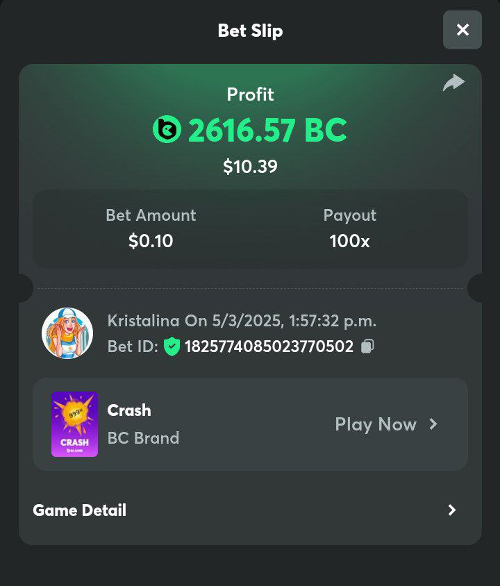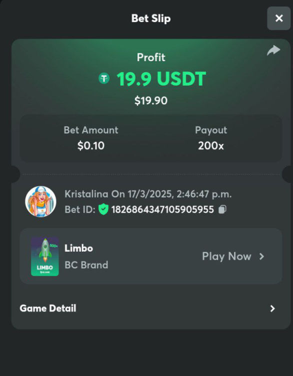 Easy 1. Deposit Txid: 4434113e293eb472a7b171d17fbe54cbfb34631824705869716f789ec0040181 2. Instagram: @LincesaMdq 3. Instagram Post: https://www.instagram.com/p/DHXgr4JspCP/?igsh=ZWgwenpqYXVreTF 4. Twitter: @Kristalinauwu 5. Like, retweet & tag: @Kristalinauwu https://x.com/Kristalinauwu/status/1901728054969274750 6. Follow BCGame Facebook: Gisela Gall 7. Limbo: https://bc.co/game-detail/1825513481832927011 8. Sports bet: Ticket ID: 2513820866270339253 9. Arabian Secret: https://bc.co/game-detail/1825439374915515681 10. Sugar Fiesta 1000: https://bc.co/game-detail/1825441146495751971 11. 2FA activated: Medium 1. Deposit TxID: 4d707ead402ff5771e270374a5fc42f5798fdc6bd13d6bf975996a5316cb53ff TxID: 39d9776a52287c2bdc8bea45c1a751ae618ef4976ed8907766ce39ac0603937f 2. Crash: https://bc.co/game-detail/1825546630112045702 3. Plinko: https://bc.co/game-detail/1825430753182757665 4. Roulette: https://bc.co/game-detail/1825527742035924514 5. Starshine Princess 1000: https://bc.co/game-detail/1825598330617384993 6. Stellar Rush: https://bc.co/game-detail/1825601183186807841 7. Keno: https://bc.co/game-detail/1825612623614982433 8: Poker Ways: https://bc.co/game-detail/1825547398747784483 9. Wukong: https://bc.co/game-detail/1825595350268898850 10. Lottery and Porsche tickets: 11. Sports bet Combo Ticket ID: 2512055034057994476 Hard 1. Wheel: https://bc.co/game-detail/1825529693239491107 2. Crash: https://bc.co/game-detail/1825774085023770502 3. CoinFlip: https://bc.online/game-detail/1825620056214876707 4. Stellar Rush: https://bc.co/game-detail/1826242186137422626 5. Plinko: https://bc.co/game-detail/1825459660201698850 6. Limbo: https://bc.online/game-detail/1826864347105905955 7. Hashdice: https://bc.online/game-detail/1826862839661034018 8. Sea of Olympus 1000: https://bc.co/game-detail/1825539068560977186 9. Gold of Olympus: https://bc.online/game-detail/1826344599486243619 10. Duck Hunter: https://bc.co/game-detail/1825605420251285539 11. Sports bet combo Ticket ID: 2513187573116055908