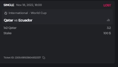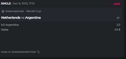 Bet ID - 2212656365359477238 I still think this was a unfair loss seeing as the Netherlands scored after the 90 minutes! But what ever it is what it is