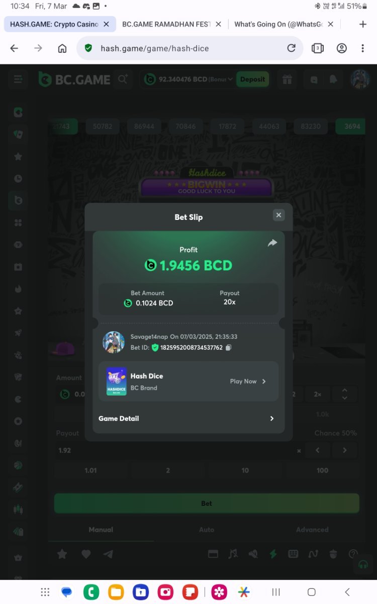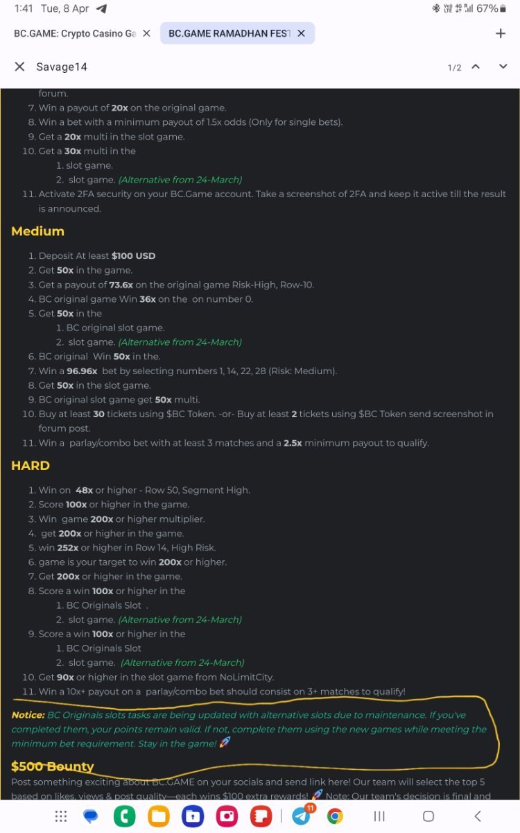 2. Easy 1. Instagram follow Id https://www.instagram.com/savage1writer/# 2. Twitter or X.com follow Id @WhatsGoingOn011 3. Win a payout of 20x on the original game. https://hash.game/game-detail/1825952008734537762 4. Get a 30x multi in the slot game https://hash.game/game-detail/1825953465141511714 5 Medium 5. Get a payout of 73.6x on the original game Risk-High, Row-10 https://hash.game/game-detail/1825954337084186145 6. BC original game Win 36x on the on number 0 https://hash.game/game-detail/1825943152130789410 7. BC original Win 50x in the. https://hash.game/game-detail/1825943860832915489 8. Win a 96.96x bet by selecting numbers 1, 14, 22, 28 (Risk: Medium https://hash.game/game-detail/1825945564570078754 9. Get 50x in the slot game https://hash.game/game-detail/1825952439030200353 Hard 10. Win on 48x or higher - Row 50, Segment High https://hash.game/game-detail/1825942540351355938 11. Win game 200x or higher multiplier https://hash.game/game-detail/1825954831090586657 12. BC Originals Slot score a win 100x or higher https://hash.game/game-detail/1825952999477367842 For Bounty https://x.com/WhatsGoingOn011/status/1906551439427584341
