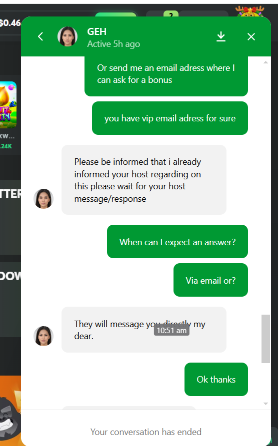 After waiting for 3 days and getting no messages from my host, I contacted live support today again. An agent firstly told me that to get a host a player has to be lvl 38, which I am. When I sent him the screenshots of my conversation with GEH from 3 days ago, he completely ignored my messages and sent some random generic messages that meant nothing. After I demanded an actual reply to my question did his colleague lied he told me that I don't have a host. So basically she lied, he lied about lvl 38 and getting a host and in the end just told me that I don't have a host.