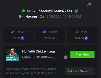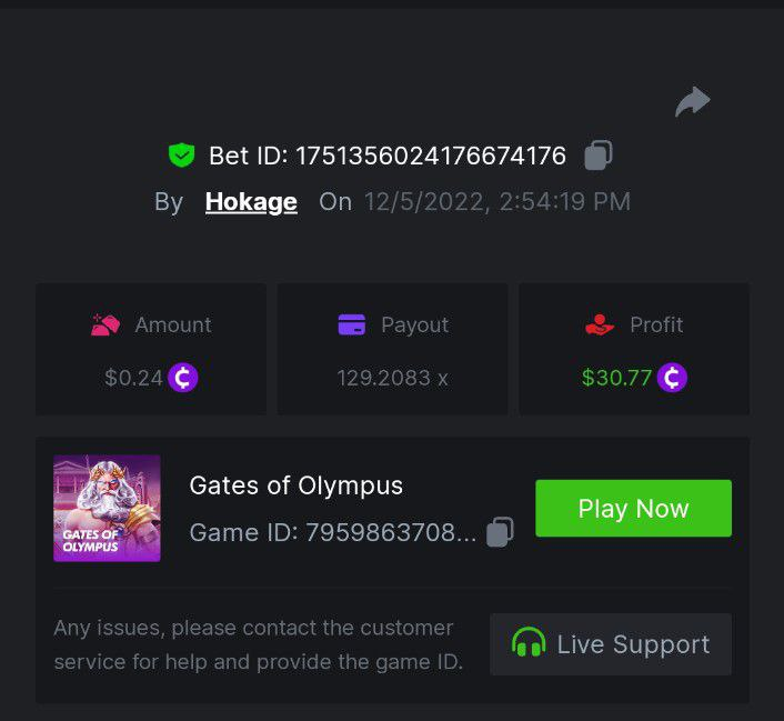 Book of Elves - 55.00x https://bc.game/#/sd/10ZA2PVJ8YRGNN Book of Piggy Bank Riches - 40.03x https://bc.game/#/sd/10ZB1LNW6QPY4Z Wolf Gang - Golden Sands - 24.17x https://bc.game/#/sd/10ZB1TCWWZE043 Athena's Glory - 26.96x https://bc.game/#/sd/10ZB2ACQ21JH8Z Hut with Chicken Legs - 135.35x https://bc.game/#/sd/10ZB2RBYX0QY37 -