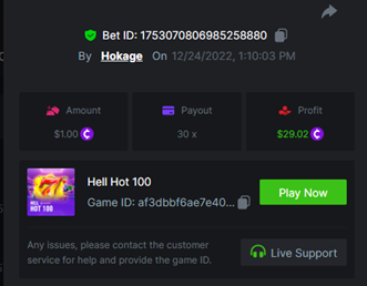 2022 Hit Slot - 22.00x https://bc.game/#/sd/10ZWCWAOTEP0YB Book of Santa - 20.00x https://bc.game/#/sd/10ZWEE0K67DZWZ Chance Machine 40 - 23.75x https://bc.game/#/sd/10ZWFJZ1ABIPSJ Hell Hot 100 - 30.00x https://bc.game/#/sd/10ZWFQQFHBXZ4J Lucky Streak 3 - 24.00x https://bc.game/#/sd/10ZWG2RBS7GQOJ Royal Xmass - 20.00x https://bc.game/#/sd/10ZWG7GB3HX9G3 -