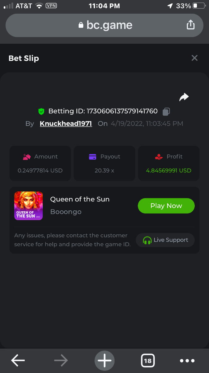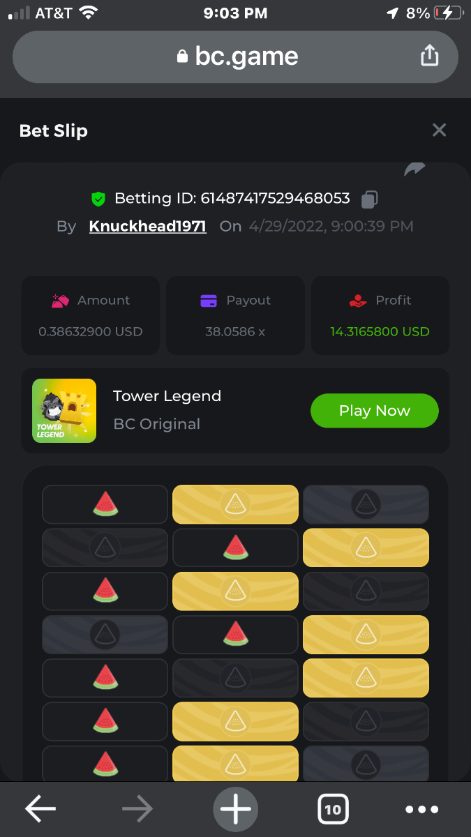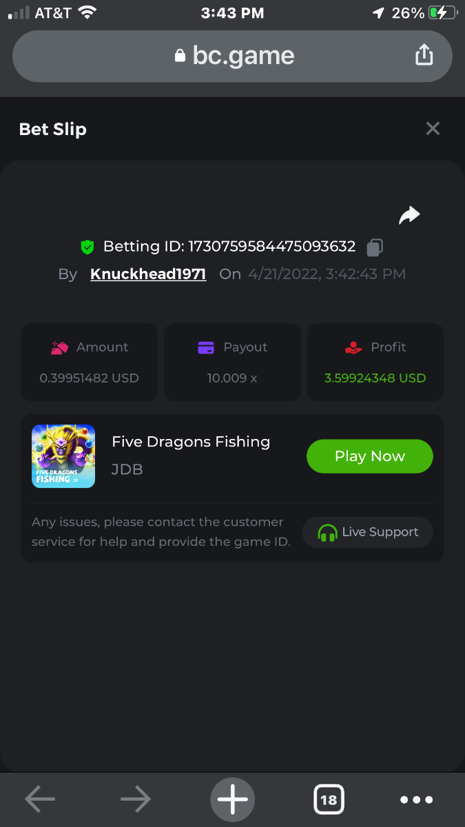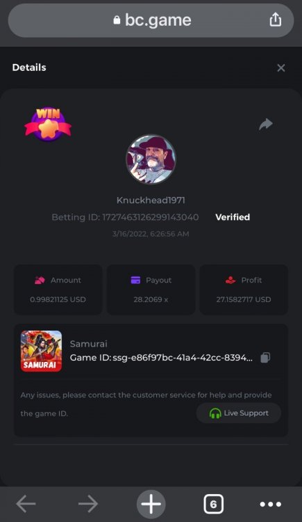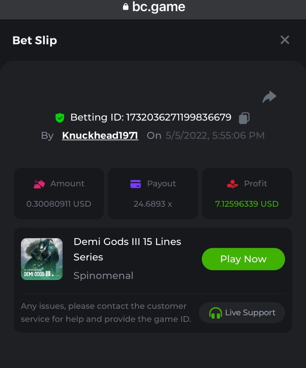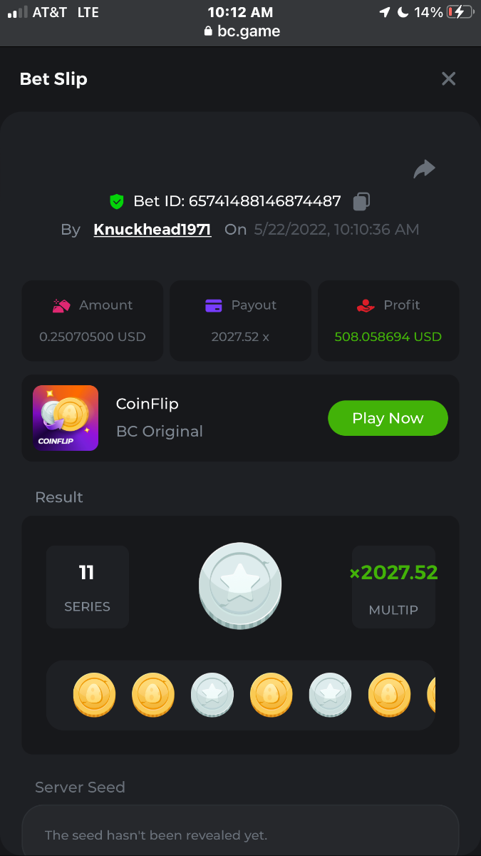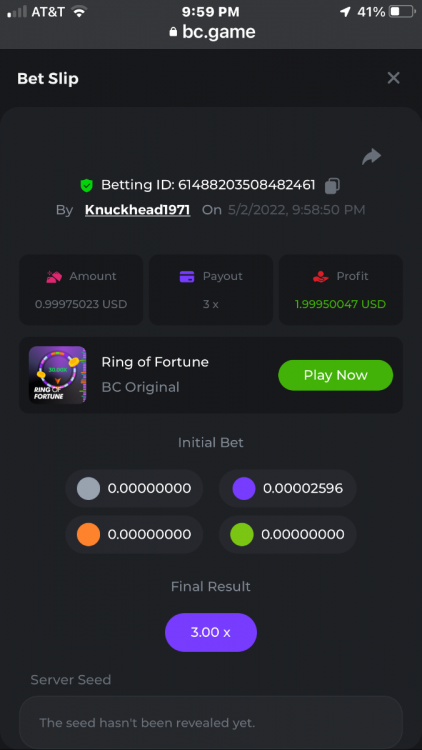 7. Grey https://bc.game/sd/?sd=10JQ3N5PEGGS2B purple https://bc.game/sd/?sd=10JQ3SOXMDQ5G3 orange https://bc.game/sd/?sd=10JQ46HQF3BBIR green https://bc.game/sd/?sd=10JQ5MRG4GET5F All wins are in order verified by time and date in succession grey first and green last bet was .00002596 BTC = $1.00 USD