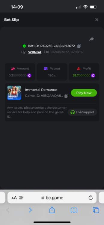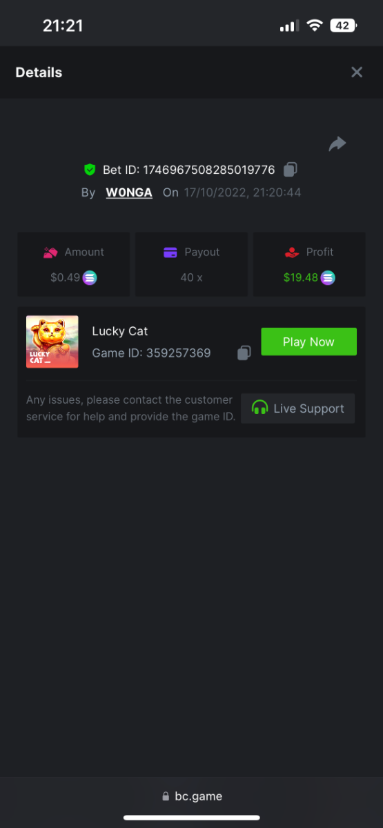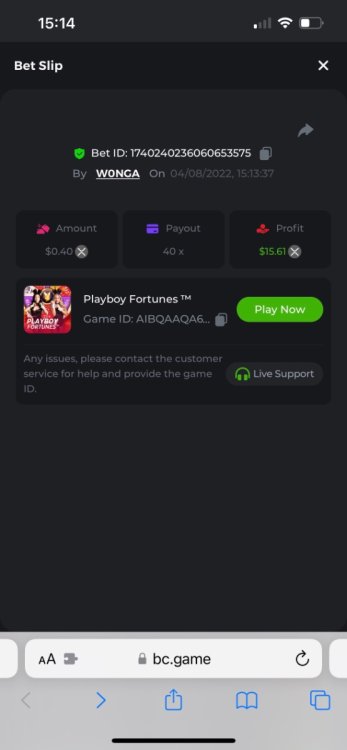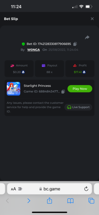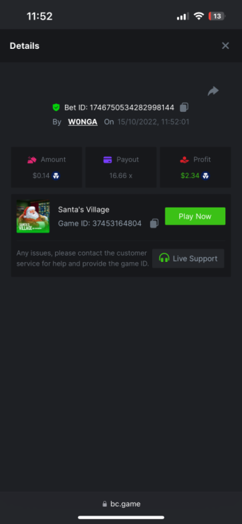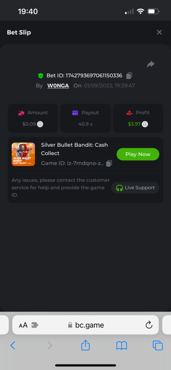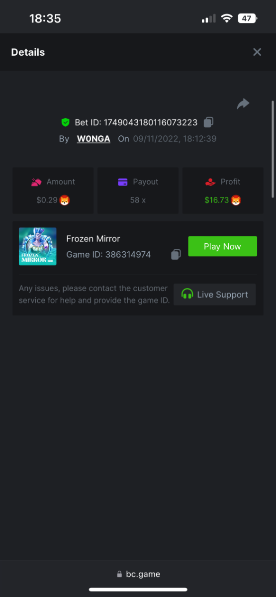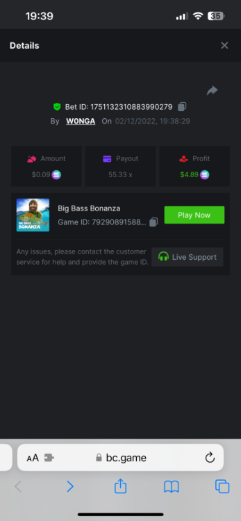 https://bc.game/#/sd/10YFF23M9VN76B This was a clean 50x win on $0.10! But the the dollar conversion says different. https://bcgame-dk2.pragmaticplay.net/gs2c/lastGameHistory.do?symbol=vs10bbbonanza&mgckey=AUTHTOKEN@11cc628b718a1c586678b11736e84ea3dfa730c7917478308de6e25bef028d13~stylename@bcgame_bcgame~SESSION@23942c19-4f81-4335-ac9a-6cefff7f9a75~SN@192ffaf4&tz=-00%3A00&mgckey=AUTHTOKEN@11cc628b718a1c586678b11736e84ea3dfa730c7917478308de6e25bef028d13~stylename@bcgame_bcgame~SESSION@23942c19-4f81-4335-ac9a-6cefff7f9a75~SN@192ffaf4 https://bc.game/#/sd/10YFG753VMQS5V https://bc.game/#/sd/10YFGJAIT2RMS3 https://bc.game/#/sd/10YFGXMC5YV8K3 https://bc.game/#/sd/10YGZ4VK6RWOIB -