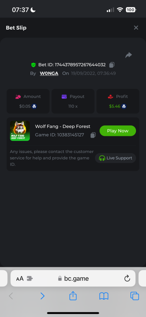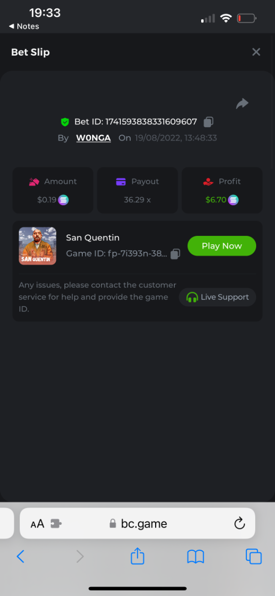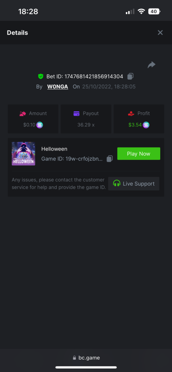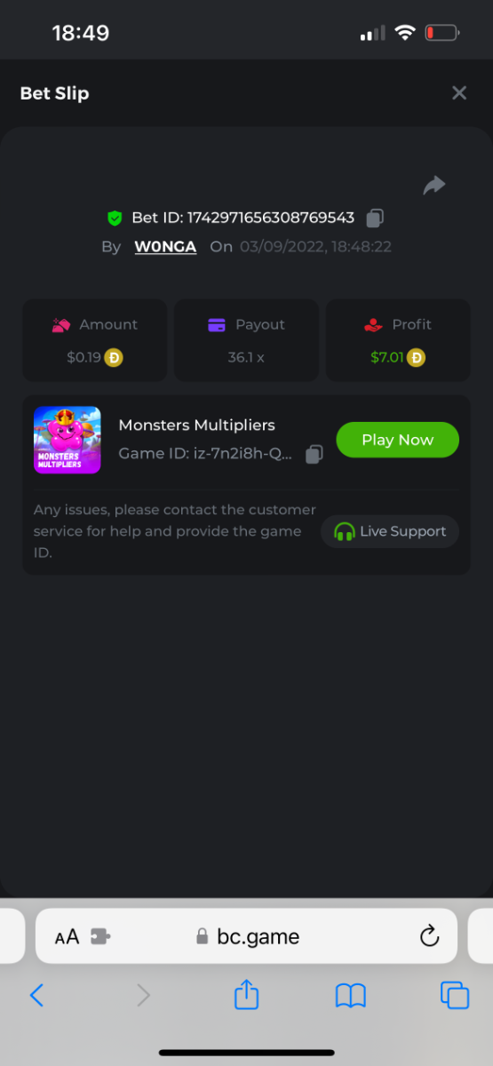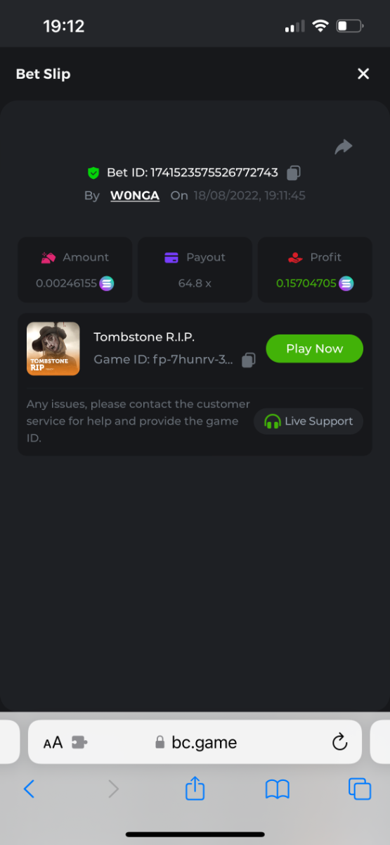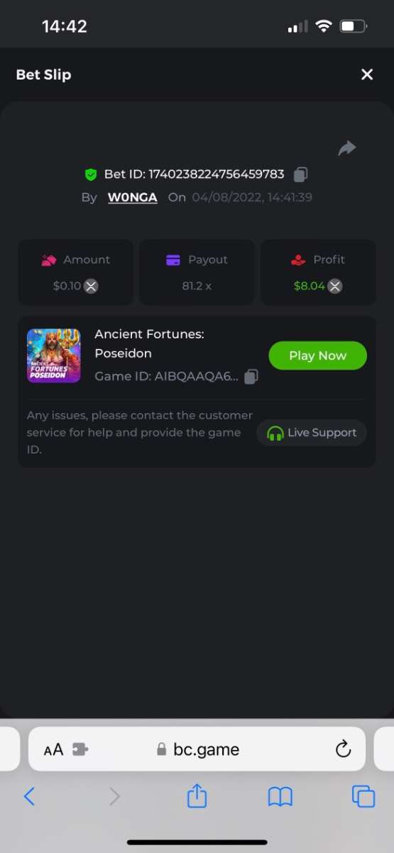 https://bc.game/#/sd/10YFF23M9VN76B This was a clean 50x win on $0.10! But the the dollar conversion says different. https://bcgame-dk2.pragmaticplay.net/gs2c/lastGameHistory.do?symbol=vs10bbbonanza&mgckey=AUTHTOKEN@11cc628b718a1c586678b11736e84ea3dfa730c7917478308de6e25bef028d13~stylename@bcgame_bcgame~SESSION@23942c19-4f81-4335-ac9a-6cefff7f9a75~SN@192ffaf4&tz=-00%3A00&mgckey=AUTHTOKEN@11cc628b718a1c586678b11736e84ea3dfa730c7917478308de6e25bef028d13~stylename@bcgame_bcgame~SESSION@23942c19-4f81-4335-ac9a-6cefff7f9a75~SN@192ffaf4 https://bc.game/#/sd/10YFG753VMQS5V https://bc.game/#/sd/10YFGJAIT2RMS3 https://bc.game/#/sd/10YFGXMC5YV8K3 https://bc.game/#/sd/10YGZ4VK6RWOIB -