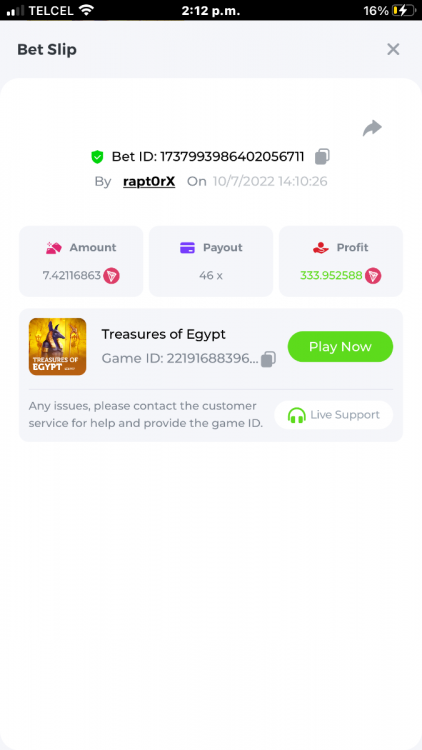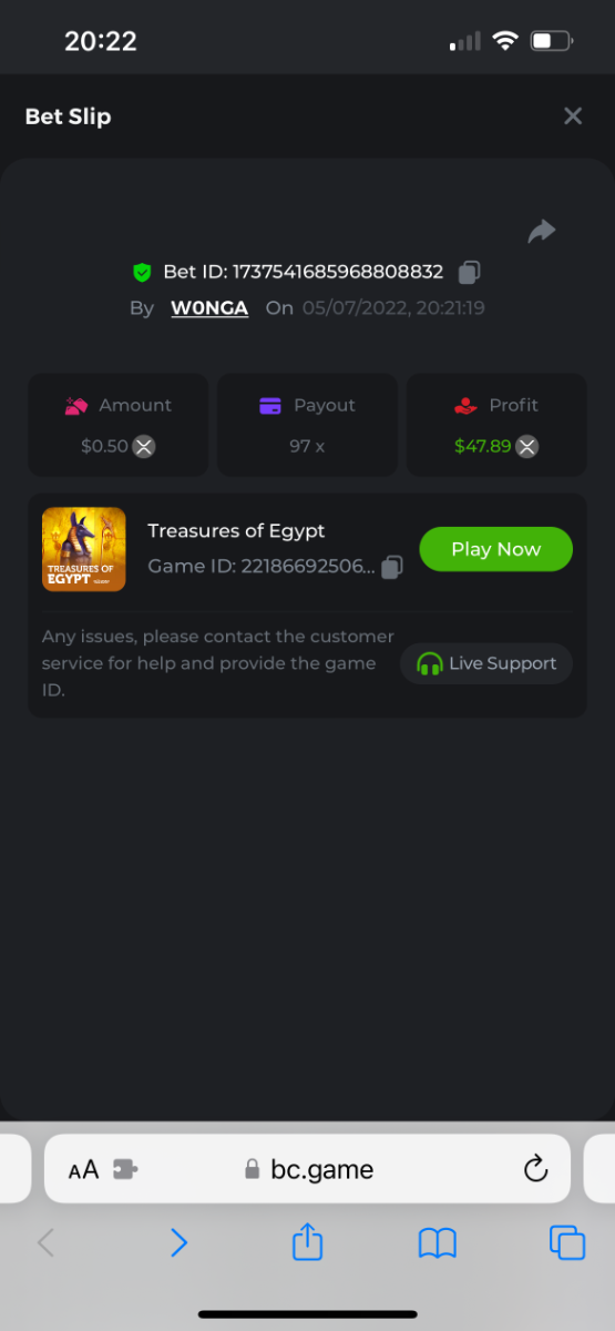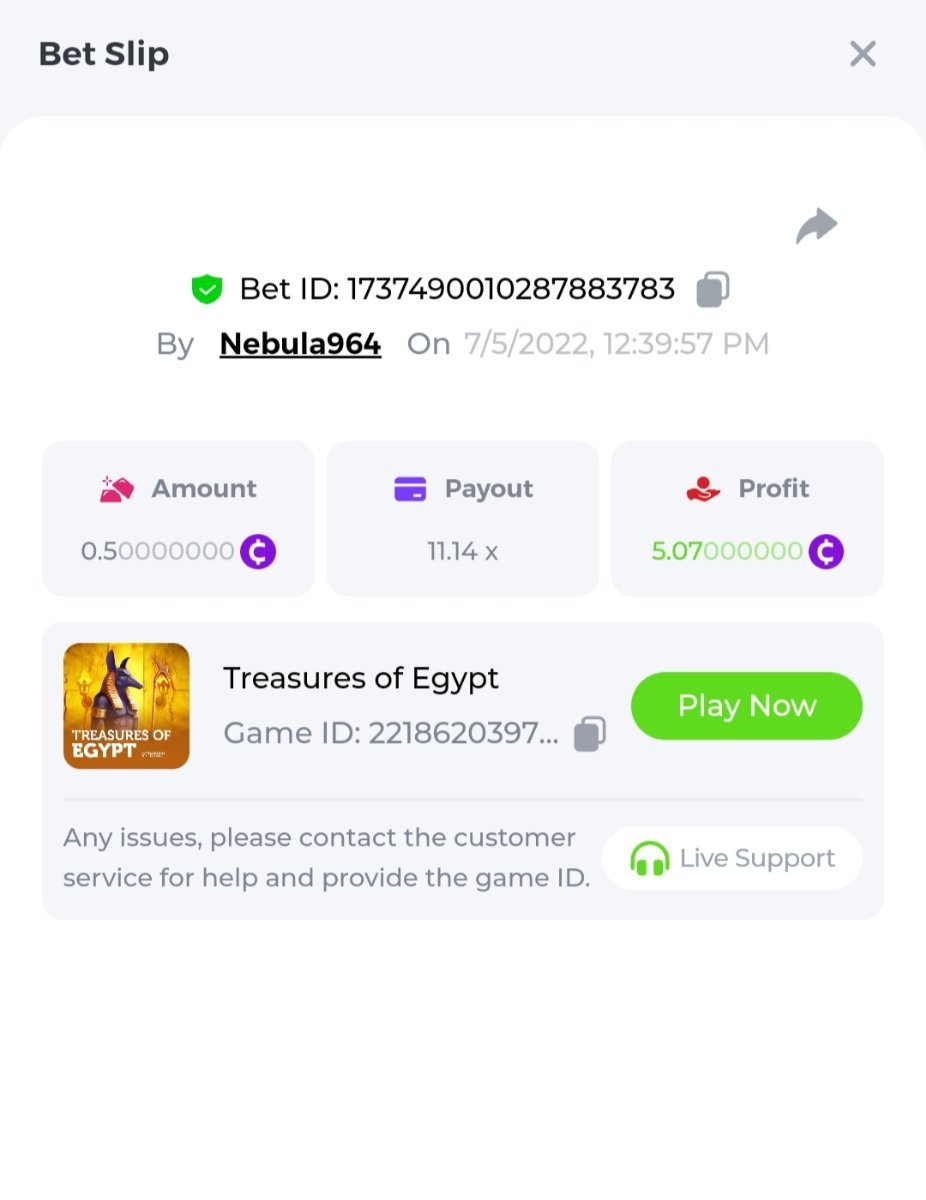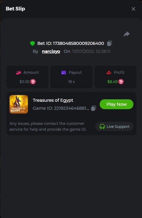 Event Team Niobium Posted July 4, 2022 Event Team Share Posted July 4, 2022 (edited) $2.5k Prestige Treasures of Egypt Challenge #37 Greetings to all BC Players! Welcome to our weekly event with a prize pool of $2,500! The game selected is Treasures of Egypt slot, where the Top 10 will take home a major reward, and the rest of the $700 will be split between all other participants. There's more: anyone who completes the bonus bounty will receive an equal share of a $500 bonus prize. (Check out more details below). What's the Challenge? Win the highest multiplier you can on Treasures of Egypt slot. By Croco Gaming. If there is a tie, the player with the higher average bet amount (in USD) shall be the winner. If there is a tie in the amount and payout, the one who posted or edited his post first will be considered in the Ranking. Minimum VIP There's no minimum VIP level Minimum Payouts Minimum payout to qualify is 10x Minimum Bet Size $0.50 USD equivalent Eligible Coins All cryptocurrencies are eligible (excepting JB) Available Prizes 1st Place....... $500 2nd Place..... $300 3rd Place...... $200 4th Place......$100 5th Place......$50 6th-10th.........$30 All other participants.........$700 Bounty Prize...$500, equal share. EXTRA BOUNTY Share a winning bet with 88x multiplier or above and receive an equal share of the $500 prize pool! Original rules apply with all minimum requirements. How to Enter To enter, copy the link of the bet you'd like to submit. Once you've copied it, paste it as a reply to this thread like so: Link: https://bc.game/sd/?sd=10O14CIKVS3WGJ In the same post, upload a screenshot of your win by clicking the game ID WITH VIEW IN USD mode ENABLED (accessible at the bottom of dropdown menu for your wallet up top. This way, we can ensure that your bet indeed met the minimum requirement at the time of placing it: Link: https://bc.game/sd/?sd=10O14CIKVS3WGJ Please combine all of your hits together in a SINGLE post. Edit your existing post for additional hits, don't create a new post. Each eligible entry must have the Bet Slip URL, failure to include it will disqualify participation in the event. Bet Slip image is not mandatory. Bets must be posted within 24 hours of placing bet in order to keep things fair for everyone. Bets must be made during the specified time window stated above. This thread will lock automatically when the time period is over. One (1) entry per household. Anyone found attempting to win multiple prizes will be disqualified from this challenge as well as all future challenges. Failure to follow instructions will result in your submission being null and void. By entering this challenge, you acknowledge that BC.Game has the final decision on results and placement. Payouts will be made within 72 hours of challenge completion, please be patient, we promise you that we haven't forgotten. We check and double check to make sure the rightful winners receive their prize. Prizes will be paid out in BCD. Good luck everyone! Edited July 9, 2022 by Niobium 6 Link to comment Share on other sites More sharing options...