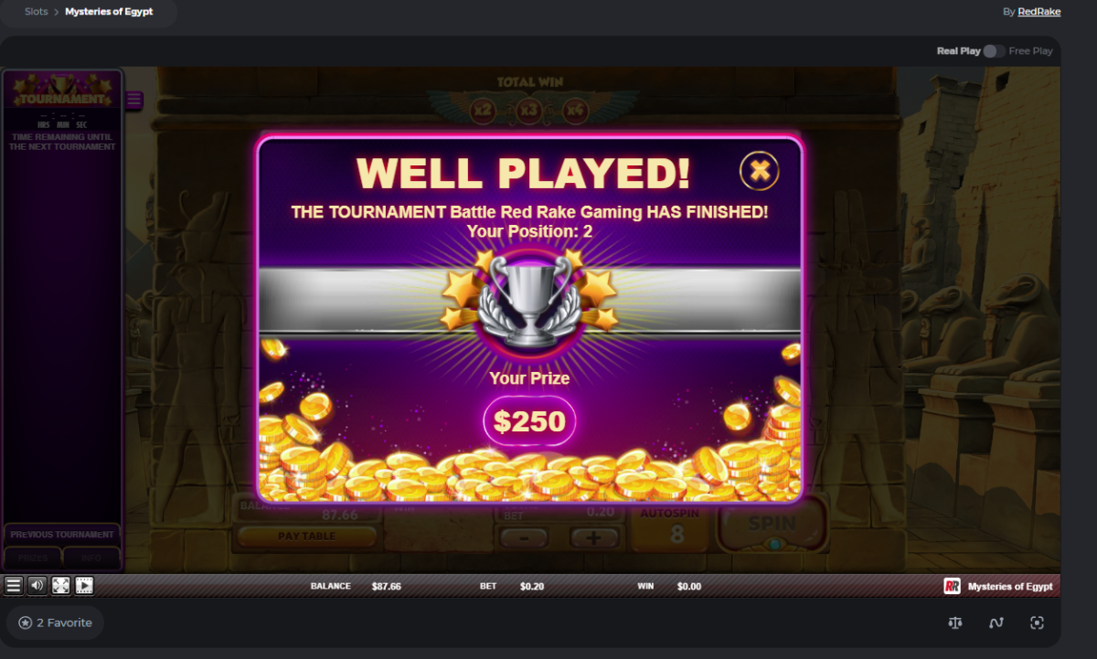 Event Team Niobium Posted September 9, 2022 Event Team Share Posted September 9, 2022 $1,500 Weekend Wagering Battle Hey everyone! RedRake is back with another weekend event. We’re giving away $1,500 in our Weekend Wagering Battle! All you have to do is play os 3 selected games and accumulate as many points as possible. The participants with the highest overall score at the end of the event are the winners! So get out there and start collecting points! The more points you have, the higher up on the leaderboard you'll be. Start playing now and good luck! - More details below. Duration: 09/09/2022 12:00 – 12/09/2022 12:00 UTC Prize Pool: $1,500 How to participate? It's based on the point acquiring system, where you have to play and achieve as much as points possible to win. The promotion is a bet independent tournament, which ensures all players can win regardless of their bet amount – meaning that you have the same chance of winning no matter what the Spin value. NOTE: 1 currency = 1 player, so please use the same currency to accumulate the points, upon changing the currency it will add new player in this case Only 1 player with the highest points will be considered. If you win €1 and stake €0.20, your score will be (1/0.20)*100 = 500. However, if you win €100 and stake €20.00, your score will be (100/20)*100 = 500. Plus, If you win €200 and stake €20.00, your score will be (200/20)*100= 1000. The tournament result will be 500 + 500 + 1000= 2000 points. Eligible Games: Play below games to participate in this event: Mysteries of Egypt Super 25 Stars Lucky Adam Minimum Bet Size There is no minimum for this you can use any amount which is minimum on the games. Eligible Coins All currencies are eligible (excepting JB, and BCL). Free Play Mode is not valid for this tournament. Playing with only 1 coin will be valid for the points accumulation once you change the coin it will then Prize Pool & Reward Breakdown The winners will win a share of the prize pool based on the detailed ranking below. The first 20 players in the leaderboard will share a prize pool of 1,500 USD! Terms & Conditions: The leaderboard will be updated automatically. The tournament is available only during real-money play. No additional deposits or costs are required to participate in the tournament. Upon changing the currency you will be re entering the competition so choose only 1 currency to participate Participation in the tournament is automatic once playing the participating games. The prizes will be award manually in the following 72 hours after the end of the tournament. Each player participating in the promotion recognises to have read and accepted the Terms and Conditions. The Company reserves the right to modify, cancel or terminate the promotion at any time. Link to comment Share on other sites More sharing options...
