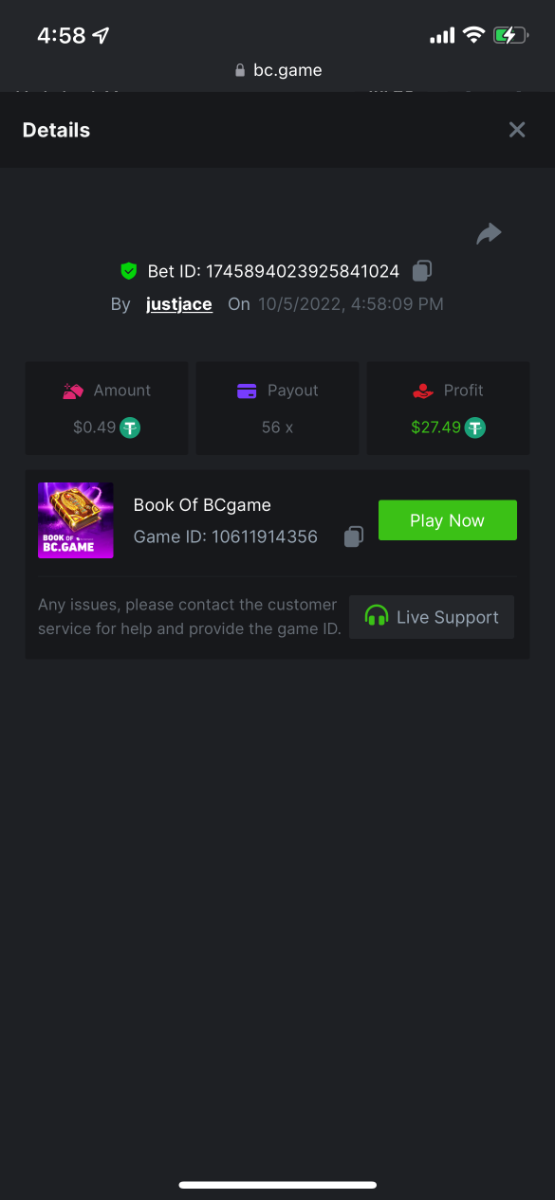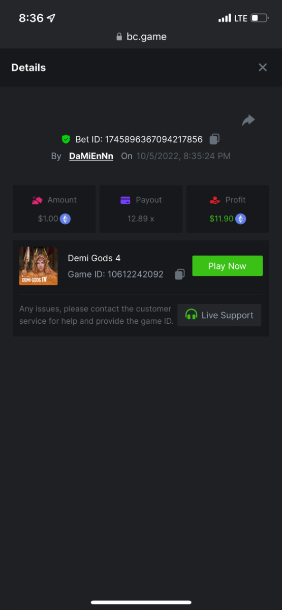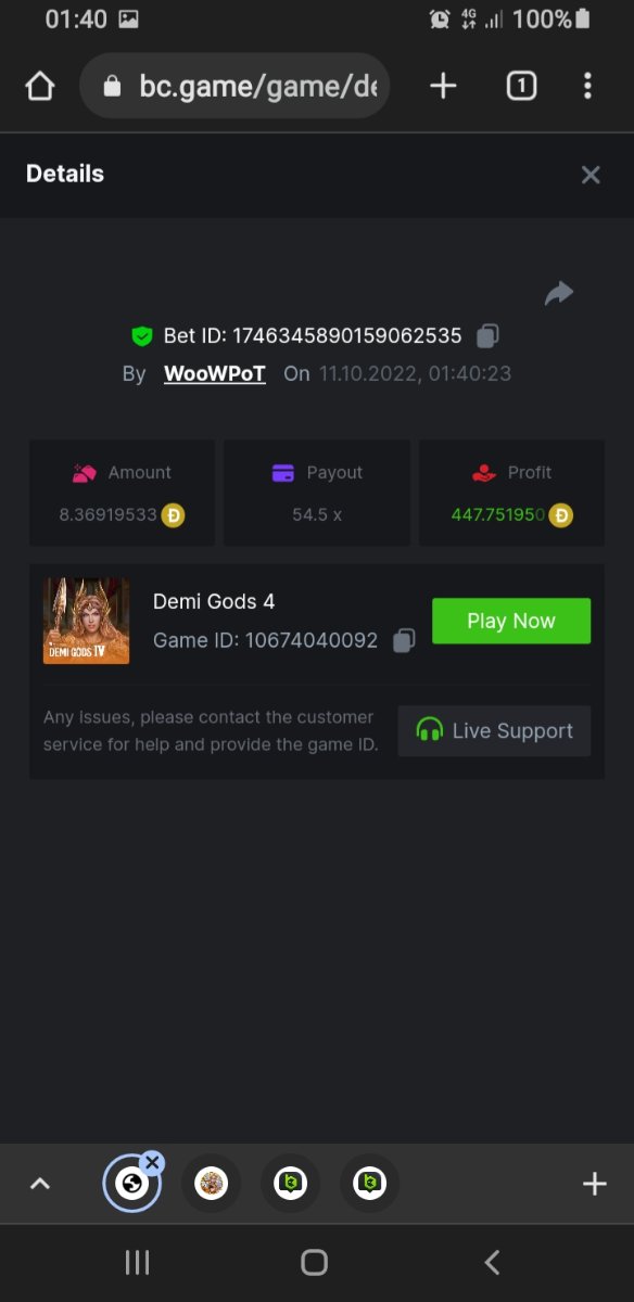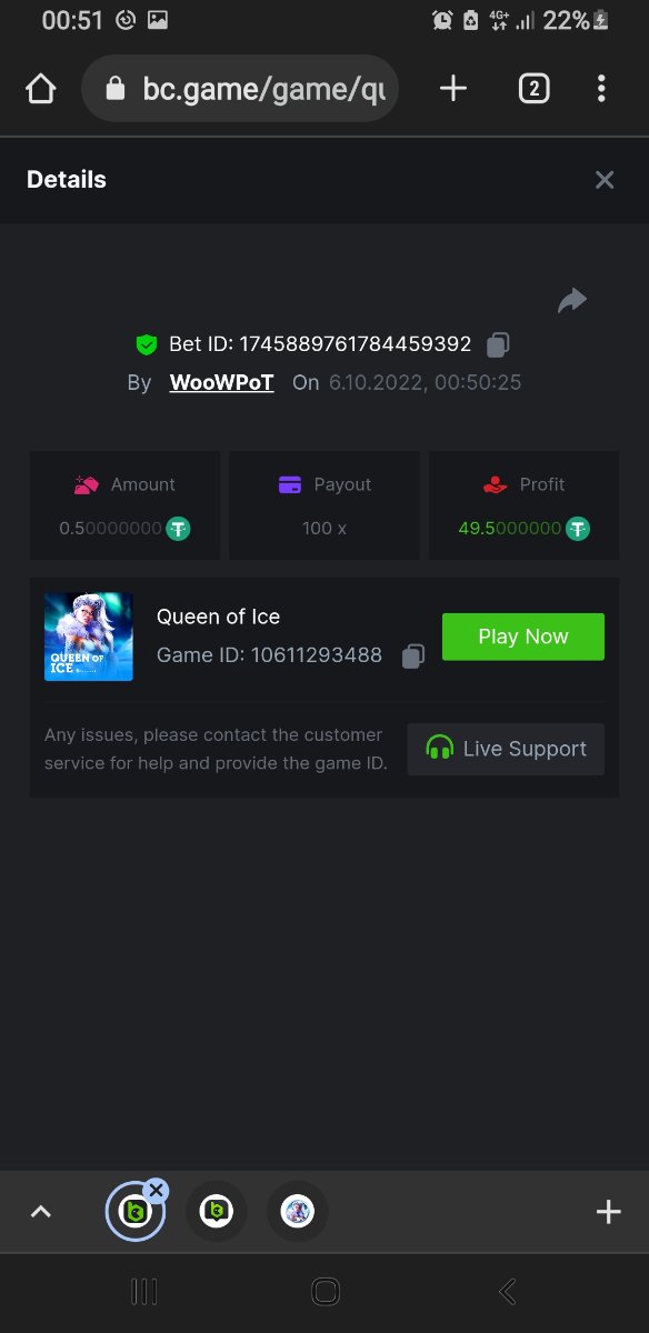 bassabar Posted October 5, 2022 Share Posted October 5, 2022 Total multiplier: 690.8666x Bounty (50x): No Queen of Ice Multiplier: 20x https://bc.game/#/sd/10UFUSG8YK6HOZ Hut With Chicken Leg Multiplier: 167.5x https://bc.game/#/sd/10UFU97VAWA1HV Demi Gods IV Multiplier: 118.2x https://bc.game/#/sd/10UFR5TPFCXF6B Wacky Monkey Multiplier: 30.67x (keeps loading?) https://bc.game/#/sd/10UFV0R2X5KF0Z Book of Bcgame Multiplier: 228.5x https://bc.game/#/sd/10UFQQTBSJMKUR Wolf Fang - Winter Storm Multiplier: 127x https://bc.game/#/sd/10UFR0DBFGCFTF Link to comment Share on other sites More sharing options...