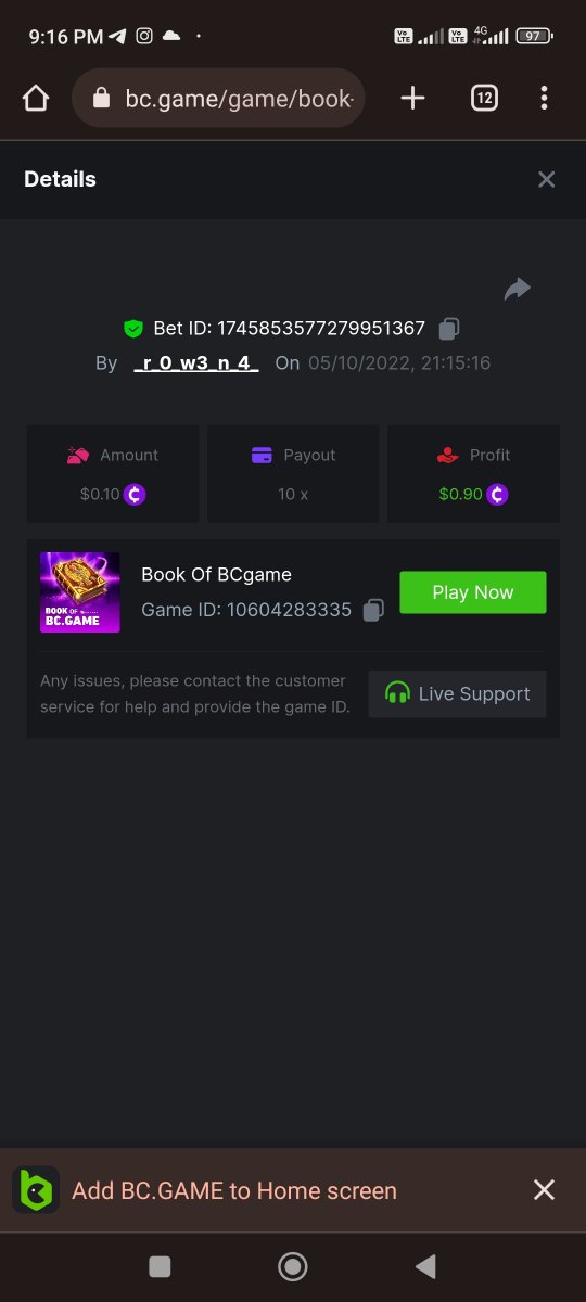 MeninaDtrap Posted October 6, 2022 Share Posted October 6, 2022 Wacky monkey https://bc.game/#/sd/10UG2UYCK614B7 43.0001x $1.80 bet https://bc.game/#/sd/10UG4P3HYLFBWZ 24x $4.50 bet Hut with the chicken leg https://bc.game/#/sd/10UG6W6QL80UFN 17.4001x $1.00 bet Demi gods https://bc.game/#/sd/10UG7JK2ALLC7N 12.89x $1.00 bet Link to comment Share on other sites More sharing options...