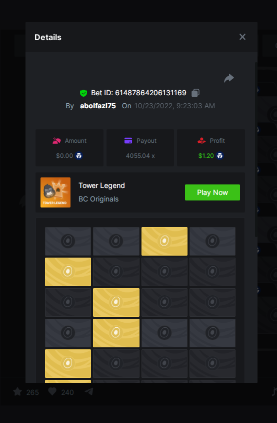 Black Tiger Posted October 23, 2022 Share Posted October 23, 2022 Read Carefully Before Start To Hunt Daily Challenges #47: Tower LegendHunt :Win the highest pay outMin Payout requirement 100xMin Level 4️Duration Starting : Now End time : 23.59 UTC Time How to Join? Make screenshot + paste your bet link + UID or Profile link To get bet link can check HERE Any coin allowedReward Prizes 1st Place....... $7 BCD2nd Place..... $5 BCD3rd Place...... $4 BCD 🎖4th Place......$3 BCD5th - 10th Place......$1 BCD 🏵 Winners will be announcing next day after Roll Point 3 Link to comment Share on other sites More sharing options...