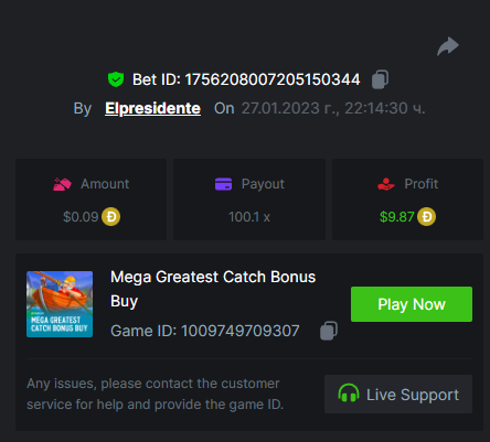 Admin BC_Jack Posted January 25, 2023 Admin Share Posted January 25, 2023 DURATION: 25th JAN - 1st FEB 09:00am GMTPRIZE POOL: $4,000 Hey Everyone! This week we will host our Top Tier battle on EVOPLAY. Your challenge is accomplishing the highest multiplier in ten selected games. The prize pool of up to $4,000 will be split among the winners, and to make it even more exciting, any participant who completes the extra bounty will receive an equal share of 10% of the prize pool. With incredible odds and a vast reward up for grabs, join us in this fantastic event! – (More details below). Eligible Games Win the highest multiplier on the Evoplay games listed below The highest multiplier reached in each game will be added together and counted as total points. Bonus buys are allowed. If the player submits multiple winning entries for the same game, the entry with the highest multiplier will be valid. How to Enter Access the game to select your Bet ID, click on the Share icon (↷) and then Copy link. Return to the topic, paste the link in the field "Reply to this topic..." E.g.: https://bc.game/#/sd/111ZK0YHPEPMVN Each eligible entry must have the Bet Slip URL, the non-inclusion of the link will disqualify participation in the event. In the same post, upload a screenshot of your win by clicking the game ID WITH VIEW IN USD mode ENABLED (accessible at the bottom of dropdown menu for your wallet up top, and Submit Reply. Done! This way, we can ensure that your bet indeed met the minimum requirement at the time of placing it: Example post - Link: https://bc.game/#/sd/111ZK0YHPEPMVN Minimum VIP Tier Must be VIP04 or higher in order to enter this event. Minimum Payout Minimum payout to qualify is 10x (in any game) for a valid entry. Minimum Bet Size Mega Greatest Catch Bonus buy - $0.10 Hot Volcano Bonus buy - $0.10 Gold Of Sirens bonus buy - $0.10 Magic Wheel - $0.10 Inner Fire bonus buy - $0.10 Hot Triple Seven Special - $0.10 Patricks Magic Field - $1.00 Rueda De Chile Bonus Buy - $0.10 Massive Luck - $0.10 Juicy Gems Bonus Buy - $0.10 Eligible Coins All cryptocurrencies are eligible (excepting JB, and BCL). Free Play Mode is not valid for this event. Prize Pool & Reward Breakdown The winners will win a share of the prize pool based on the detailed ranking below. Anyone who completes the side bounty will receive a share of a 10% of the prize pool. Participants Prize Pool 1st place 2nd place 3rd place 4th place 5th-10th 11th+ Bounty Prize 1-100 $2,000 $500 $250 $150 $100 Equal share of $300 Equal share of $500 Equal share of $200 101-150 $3,000 $750 $375 $225 $150 Equal share of $450 Equal share of $750 Equal share of $300 151-200 $4,000 $1,000 $500 $300 $200 Equal share of $600 Equal share of $1,000 Equal share of $400 BOUNTY - Share a bet that shows exactly 50x payout on any of the ten games within the timeframe of this event and you will receive a share of 10% of the prize pool! If nobody wins exactly the payout, the player/s closest to the payout will win this bounty! Original rules apply with a minimum bet, minimum payout & VIP. GENERAL TERMS Please combine all of your hits together in a SINGLE post. Edit your existing post for additional hits, don't create a new post. Each eligible entry must have the Bet Slip URL, failure to include it will disqualify participation in the event. Bet Slip image is not mandatory. Bets must be posted within 24 hours of placing bet in order to keep things fair for everyone. Bets must be made during the specified time window stated above. This thread will lock automatically when the time period is over. One (1) entry per household. Anyone found attempting to win multiple prizes will be disqualified from this challenge as well as all future challenges. Failure to follow instructions will result in your submission being null and void. By entering this challenge, you acknowledge that BC.Game has the final decision on results and placement. Payouts will be distributed after the event is finished. Please note that it could take up to 72 hours after the completion of the event. Link to comment Share on other sites More sharing options...