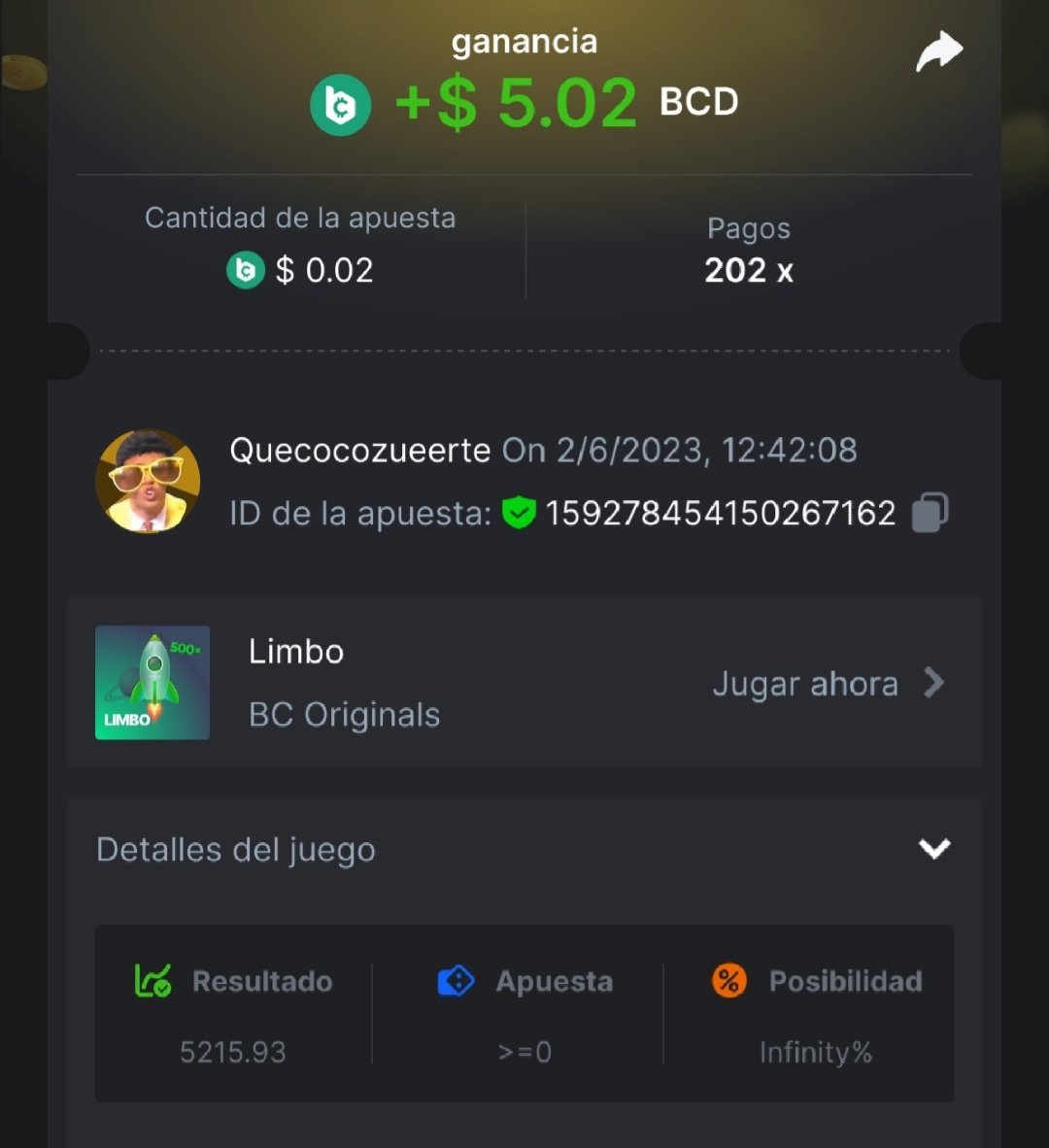 Maksypro Posted June 2, 2023 Share Posted June 2, 2023 Read Carefully Before Start To Hunt Daily Challenges #254 LIMBO Hunt : Win the highest multiplier Min Multiplier requirement 100x Min Level 4 ๏ธDuration Starting : Now End time : 23.59 UTC Time How to Join? Make screenshot + paste your bet link + UID or Profile link Any coin, with min bet 0.01 USD is allowed (jb/bb/bcl not allowed) Reward Prizes 1st Place.....$7 BCD 2nd Place.....$5 BCD 3rd Place.....$4 BCD 4th Place.....$3 BCD 5th Place.....$2 BCD ๐ต Winners will be announcing next day after Roll Point! 2 Link to comment Share on other sites More sharing options...