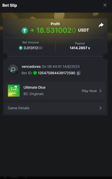 Maksypro Posted June 13, 2023 Share Posted June 13, 2023 Read Carefully Before Start To Hunt Daily Challenges #265 ULTIMATE DICE Hunt : Win the highest multiplier Min Payout requirement 100x Min Level 4 ๏ธDuration Starting : Now End time : 23.59 UTC Time How to Join? Make screenshot + paste your bet link + UID or Profile link Any coin, with min bet 0.01 USD is allowed (jb/bb/bcl not allowed) Reward Prizes 1st Place.....$7 BCD 2nd Place.....$5 BCD 3rd Place.....$4 BCD 4th Place.....$3 BCD 5th Place.....$2 BCD ๐ต Winners will be announcing next day after Roll Point! Link to comment Share on other sites More sharing options...