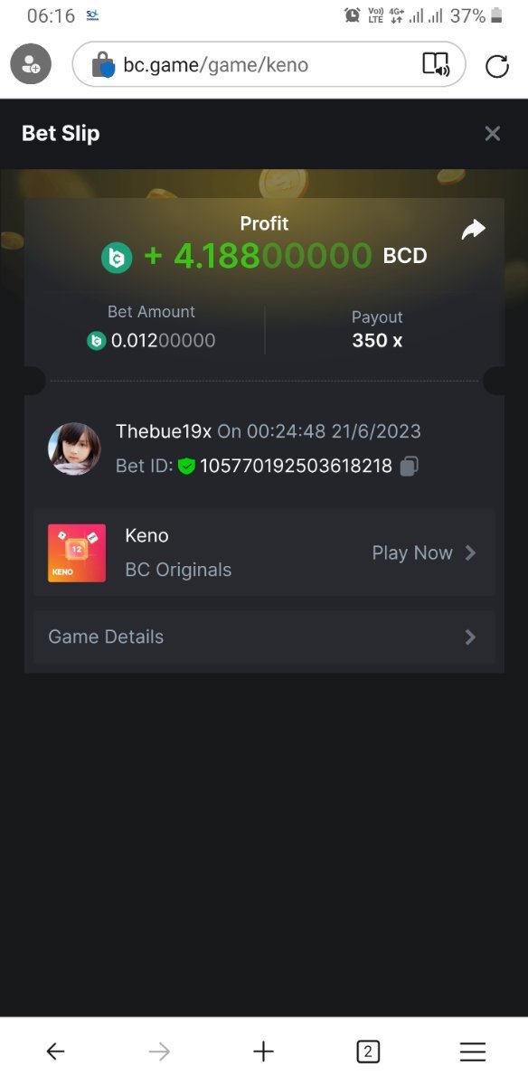 Maksypro Posted June 20, 2023 Share Posted June 20, 2023 Read Carefully Before Start To Hunt Forum Daily Challenges #272 Keno Hunt : Win the highest pay out Min Payout requirement 90x Min Level 4 ๏ธDuration Starting : Now End time : 23.59 UTC Time How to Join? Make screenshot + paste your bet link + UID or Profile link Any coin, with min bet 0.01 USD is allowed (jb/bb/bcl not allowed) Reward Prizes 1st Place.....$7 BCD 2nd Place.....$5 BCD 3rd Place.....$4 BCD 4th Place.....$3 BCD 5th Place.....$2 BCD ๐ต Winners will be announcing next day after Roll Point! Link to comment Share on other sites More sharing options...