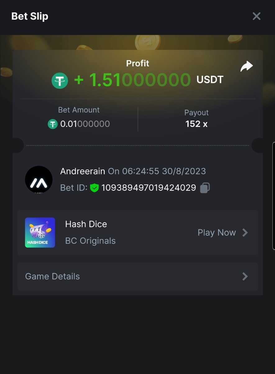 Moderator Giandreas Posted August 29, 2023 Moderator Share Posted August 29, 2023 Read Carefully Before Start To Hunt Forum Daily Challenges #342 hash diceHunt : Hash dice Win the highest pay out Min Payout min 20x Min Level 4️Duration Starting : Now End time : 23.59 UTC Time How to Join? Make screenshot + paste your bet link + UID or Profile link Any coin, with min bet 0.01 USD is allowed (jb/bb/bcl not allowed)Reward Prizes 1st Place.....$7 BCD 2nd Place.....$5 BCD 3rd Place.....$4 BCD 4th Place.....$3 BCD 5th Place.....$2 BCD 🏵 Winners will be announcing next day after Roll Point! 1 Link to comment Share on other sites More sharing options...