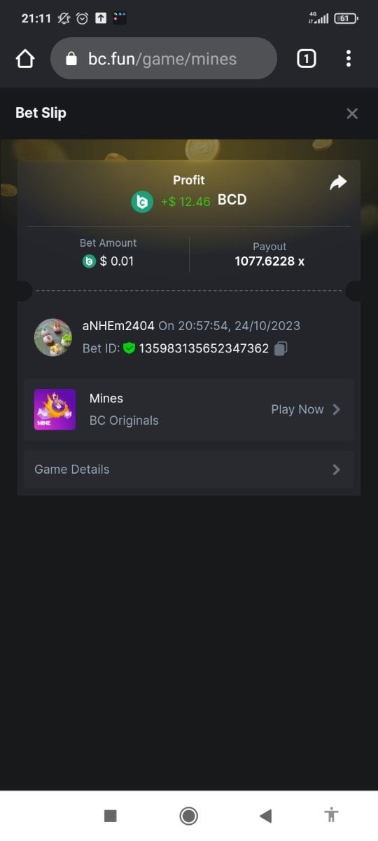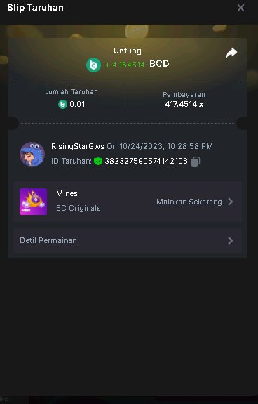winjet Posted October 24, 2023 Share Posted October 24, 2023 11 hours ago, Kikikom said: Read Carefully Before Start To Hunt Forum Daily Challenges #397Hunt : Mines Win the highest pay out Min Payout : 50x Min Level 4️Duration Starting : Now End time : 23.59 UTC Time How to Join? Make screenshot + paste your bet link + UID or Profile link Any coin, with min bet 0.01 USD is allowed (jb/bb/bcl not allowed)Reward Prizes 1st Place.....$7 BCD 2nd Place.....$5 BCD 3rd Place.....$4 BCD 4th Place.....$3 BCD 5th Place.....$2 BCD 🏵 Winners will be announcing next day after Roll Point! Link to comment Share on other sites More sharing options...