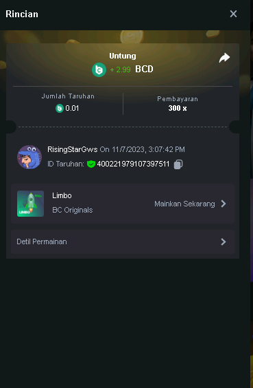 Moderator Giandreas Posted November 7, 2023 Moderator Share Posted November 7, 2023 Read Carefully Before Start To Hunt Forum Daily Challenges #411Hunt : Limbo Win the highest pay out Min Payout : x20 Min Level 4️Duration Starting : Now End time : 23.59 UTC Time How to Join? Make screenshot + paste your bet link + UID or Profile link Any coin, with min bet 0.01 USD is allowed (jb/bb/bcl not allowed)Reward Prizes 1st Place.....$7 BCD 2nd Place.....$5 BCD 3rd Place.....$4 BCD 4th Place.....$3 BCD 5th Place.....$2 BCD 🏵 Winners will be announcing next day after Roll Point! 1 Link to comment Share on other sites More sharing options...