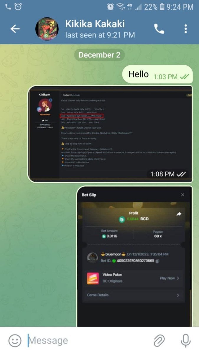 same problem here I won challenge no 435 on the forum I messaged you ( @Kikikom31 ) on telegram. you have seen my messages but still no reply I tagged you in BC chat but no response from you. what should I do? My telegram id @Haris7532