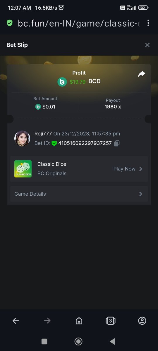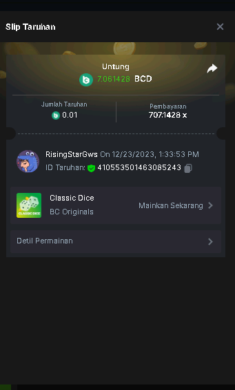 Moderator Giandreas Posted December 23, 2023 Moderator Share Posted December 23, 2023 Read Carefully Before Start To Hunt Forum Daily Challenges #457Hunt : classic dice Win the highest pay out Min Payout : 50x Min Level 10 ️Duration Starting : Now End time : 23.59 UTC Time How to Join? Make screenshot + paste your bet link + UID or Profile link Any coin, with min bet 0.01 USD is allowed (jb/bb/bcl not allowed) Reward Prizes 1st Place.....$7 BCD 2nd Place.....$5 BCD 3rd Place.....$4 BCD 4th Place.....$3 BCD 5th Place.....$2 BCD 🏵 Winners will be announcing next day after Roll Point! Link to comment Share on other sites More sharing options...