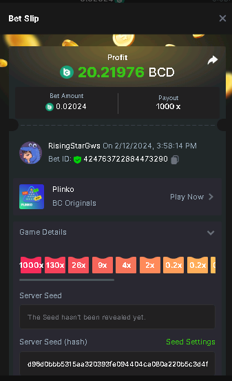 Moderator Giandreas Posted February 12, 2024 Moderator Share Posted February 12, 2024 Read Carefully Before Start To Hunt Forum Daily Challenges #508Hunt : Plinko Win the highest pay out Min Payout : x120 Min Level 10️Duration Starting : Now End time : 23.59 UTC Time How to Join? Make screenshot + paste your bet link + UID or Profile link Any coin, with min bet 0.01 USD is allowed (jb/bb/bcl not allowed)Reward Prizes 1st Place.....$7 BCD 2nd Place.....$5 BCD 3rd Place.....$4 BCD 4th Place.....$3 BCD 5th Place.....$2 BCD 🏵 Winners will be announcing next day after Roll Point! 1 Link to comment Share on other sites More sharing options...