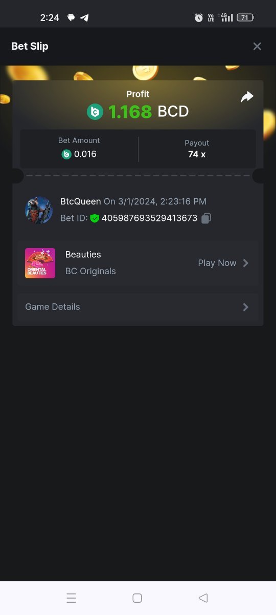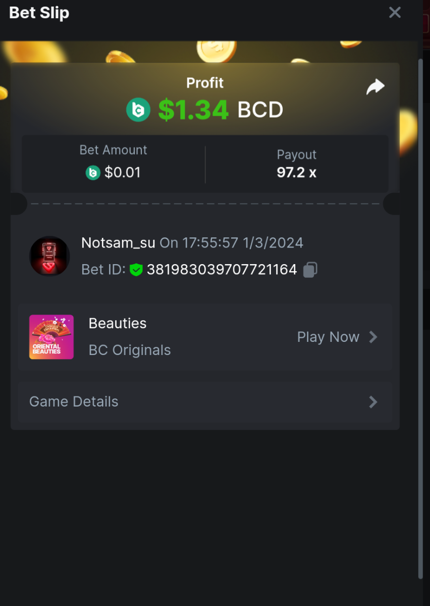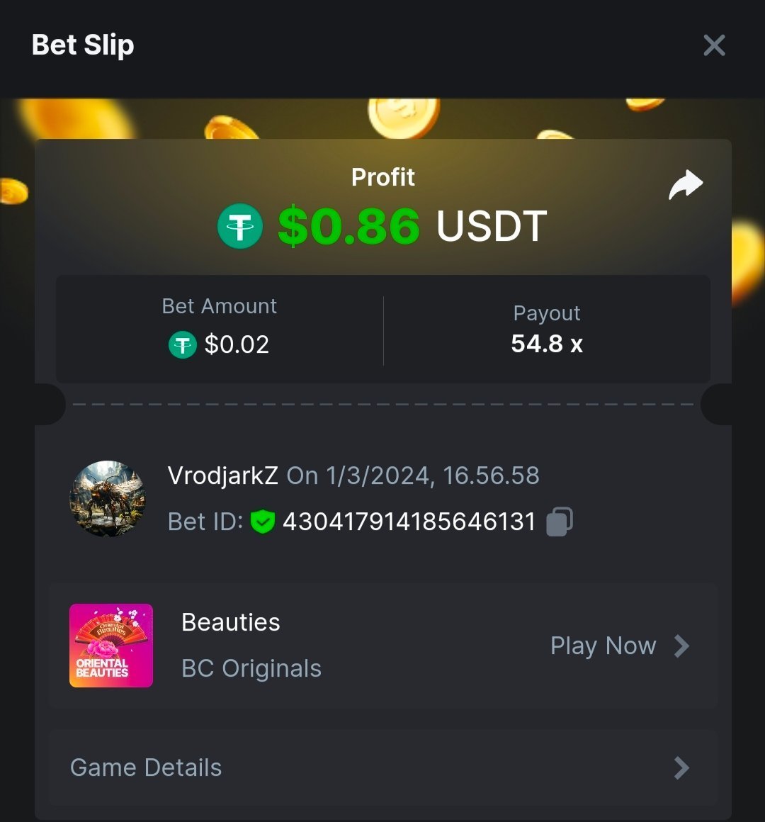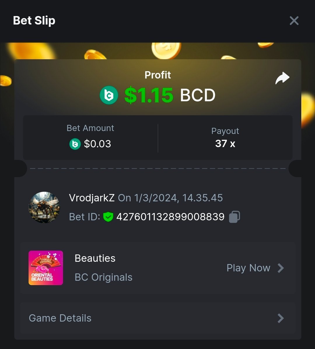 Moderator Giandreas Posted March 1, 2024 Moderator Share Posted March 1, 2024 Read Carefully Before Start To Hunt Forum Daily Challenges #526Hunt : Oriental Beauties Win the highest pay out Min Payout : 20x Min Level 10 ️Duration Starting : Now End time : 23.59 UTC Time How to Join? Make screenshot + paste your bet link + UID or Profile link Any coin, with min bet 0.01 USD is allowed (jb/bb/bcl not allowed) Reward Prizes 1st Place.....$7 BCD 2nd Place.....$5 BCD 3rd Place.....$4 BCD 4th Place.....$3 BCD 5th Place.....$2 BCD 🏵 Winners will be announcing next day after Roll Point! Link to comment Share on other sites More sharing options...