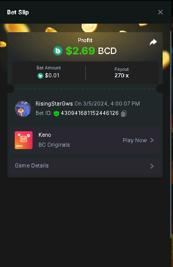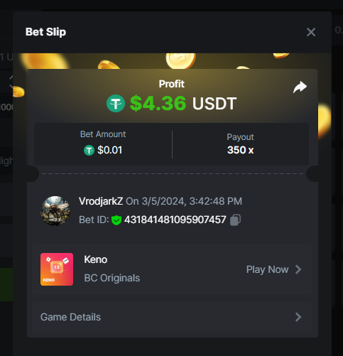Moderator Giandreas Posted March 5, 2024 Moderator Share Posted March 5, 2024 Read Carefully Before Start To Hunt Forum Daily Challenges #530Hunt : Keno Win the highest pay out Min Payout : 90x Min Level 10️Duration Starting : Now End time : 23.59 UTC Time How to Join? Make screenshot + paste your bet link + UID or Profile link Any coin, with min bet 0.01 USD is allowed (jb/bb/bcl not allowed)Reward Prizes 1st Place.....$7 BCD 2nd Place.....$5 BCD 3rd Place.....$4 BCD 4th Place.....$3 BCD 5th Place.....$2 BCD 🏵 Winners will be announcing next day after Roll Point! Link to comment Share on other sites More sharing options...