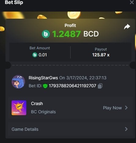 Moderator Giandreas Posted March 17, 2024 Moderator Share Posted March 17, 2024 Read Carefully Before Start To Hunt Forum Daily Challenges #542Hunt : Crash Win the highest pay out Min Payout : x20 Min Level 10 ️Duration Starting : Now End time : 23.59 UTC Time How to Join? Make screenshot + paste your bet link + UID or Profile link Any coin, with min bet 0.01 USD is allowed (jb/bb/bcl not allowed) Reward Prizes 1st Place.....$7 BCD 2nd Place.....$5 BCD 3rd Place.....$4 BCD 4th Place.....$3 BCD 5th Place.....$2 BCD 🏵 Winners will be announcing next day after Roll Point! 1 Link to comment Share on other sites More sharing options...