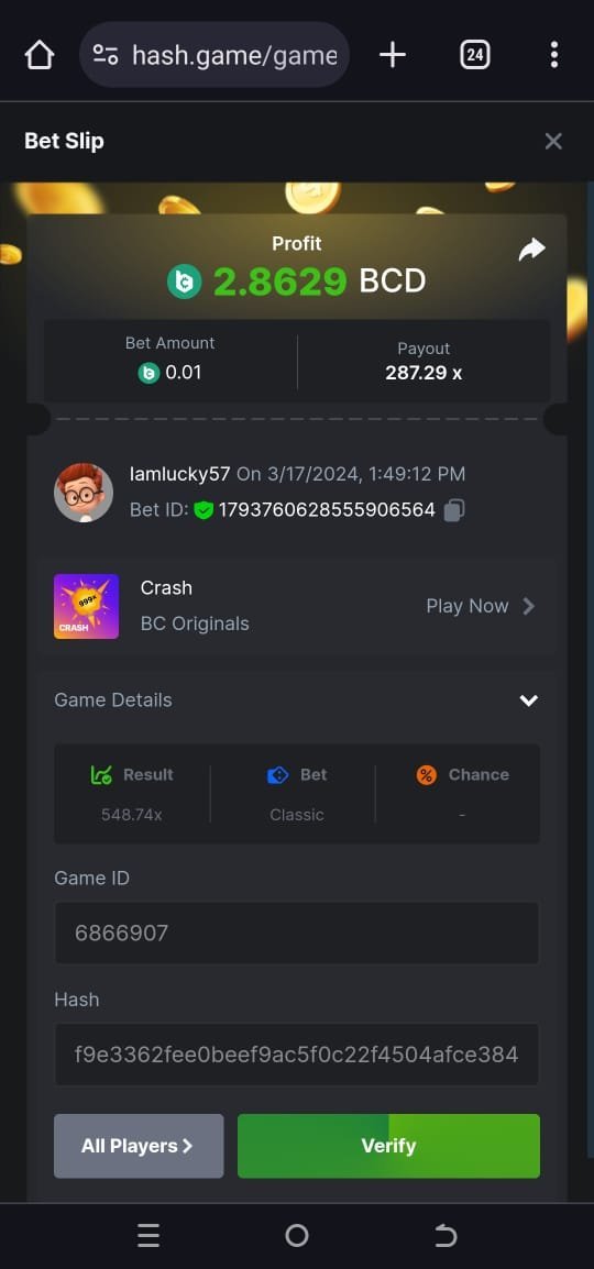 Iamlucky57 Posted March 17, 2024 Share Posted March 17, 2024 18 hours ago, Kikikom said: Read Carefully Before Start To Hunt Forum Daily Challenges #542Hunt : Crash Win the highest pay out Min Payout : x20 Min Level 10 ️Duration Starting : Now End time : 23.59 UTC Time How to Join? Make screenshot + paste your bet link + UID or Profile link Any coin, with min bet 0.01 USD is allowed (jb/bb/bcl not allowed) Reward Prizes 1st Place.....$7 BCD 2nd Place.....$5 BCD 3rd Place.....$4 BCD 4th Place.....$3 BCD 5th Place.....$2 BCD 🏵 Winners will be announcing next day after Roll Point! https://hash.game/#/sd/11UTCOMRRDZ3FF Uid: 5655852 Link to comment Share on other sites More sharing options...