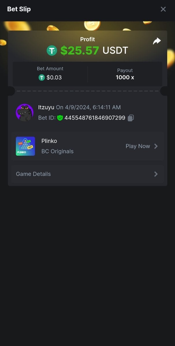 Moderator Giandreas Posted April 8, 2024 Moderator Share Posted April 8, 2024 Read Carefully Before Start To Hunt Forum Daily Challenges #564Hunt : Plinko Win the highest pay out Min Payout : 120x Min Level 10 ️Duration Starting : Now End time : 23.59 UTC Time How to Join? Make screenshot + paste your bet link + UID or Profile link Any coin, with min bet 0.01 USD is allowed (jb/bb/bcl not allowed) Reward Prizes 1st Place.....$7 BCD 2nd Place.....$5 BCD 3rd Place.....$4 BCD 4th Place.....$3 BCD 5th Place.....$2 BCD 🏵 Winners will be announcing next day after Roll Point! Link to comment Share on other sites More sharing options...