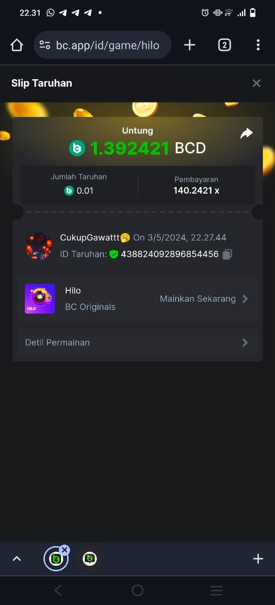 Moderator Giandreas Posted May 3, 2024 Moderator Share Posted May 3, 2024 Read Carefully Before Start To Hunt Forum Daily Challenges #589Hunt : HiLo Win the highest pay out Min Payout : x20 Min Level 10 ️Duration Starting : Now End time : 23.59 UTC Time How to Join? Make screenshot + paste your bet link + UID or Profile link Any coin, with min bet 0.01 USD is allowed (jb/bb/bcl not allowed) Reward Prizes 1st Place.....$7 BCD 2nd Place.....$5 BCD 3rd Place.....$4 BCD 4th Place.....$3 BCD 5th Place.....$2 BCD 🏵 Winners will be announcing next day after Roll Point! 1 Link to comment Share on other sites More sharing options...