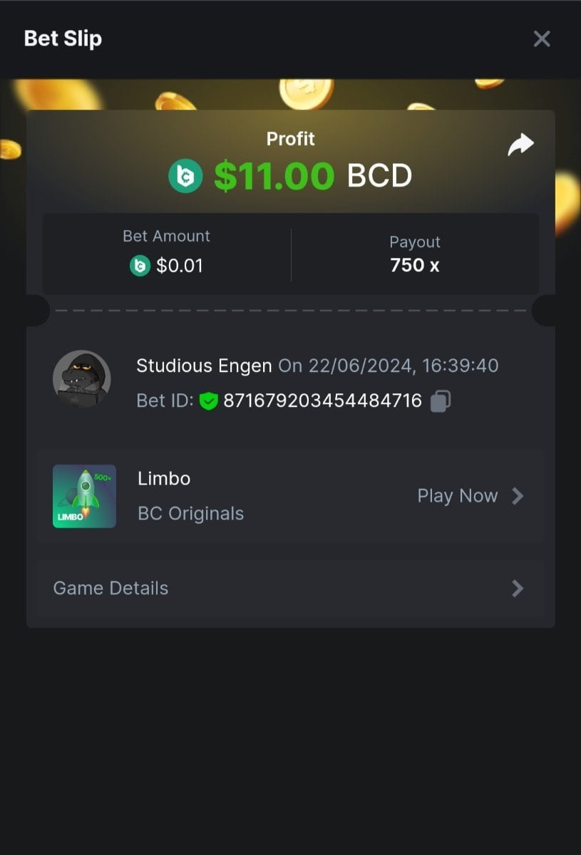 Moderator Giandreas Posted June 22, 2024 Moderator Share Posted June 22, 2024 Read Carefully Before Start To Hunt Forum Daily Challenges #639Hunt : Limbo Win the highest pay out Min Payout : 20 Min Level 10 ️Duration Starting : Now End time : 23.59 UTC Time How to Join? Make screenshot + paste your bet link + UID or Profile link Any coin, with min bet 0.01 USD is allowed (jb/bb/bcl not allowed) Reward Prizes 1st Place.....$7 BCD 2nd Place.....$5 BCD 3rd Place.....$4 BCD 4th Place.....$3 BCD 5th Place.....$2 BCD 🏵 Winners will be announcing next day after Roll Point! 1 Link to comment Share on other sites More sharing options...