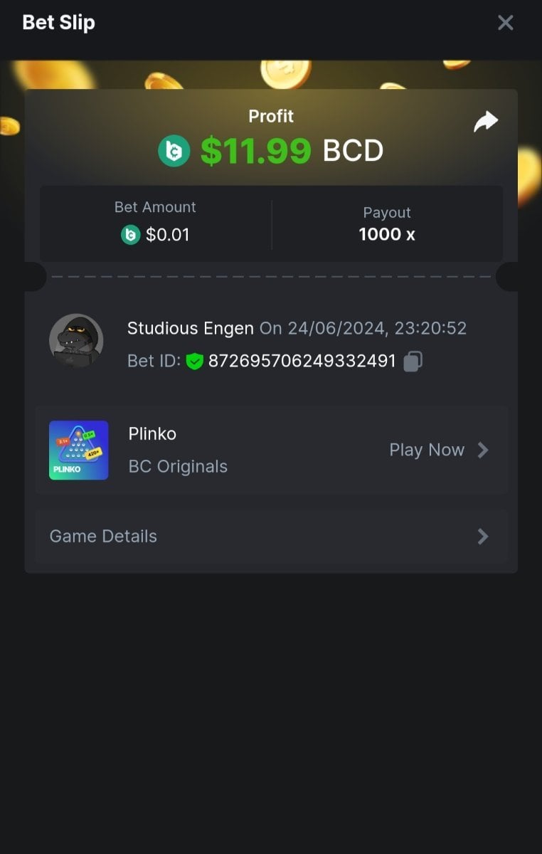 Moderator Giandreas Posted June 24, 2024 Moderator Share Posted June 24, 2024 Read Carefully Before Start To Hunt Forum Daily Challenges #641Hunt : Plinko Win the highest pay out Min Payout : 120x Min Level 10️Duration Starting : Now End time : 23.59 UTC Time How to Join? Make screenshot + paste your bet link + UID or Profile link Any coin, with min bet 0.01 USD is allowed (jb/bb/bcl not allowed)Reward Prizes 1st Place.....$7 BCD 2nd Place.....$5 BCD 3rd Place.....$4 BCD 4th Place.....$3 BCD 5th Place.....$2 BCD 🏵 Winners will be announcing next day after Roll Point! Link to comment Share on other sites More sharing options...