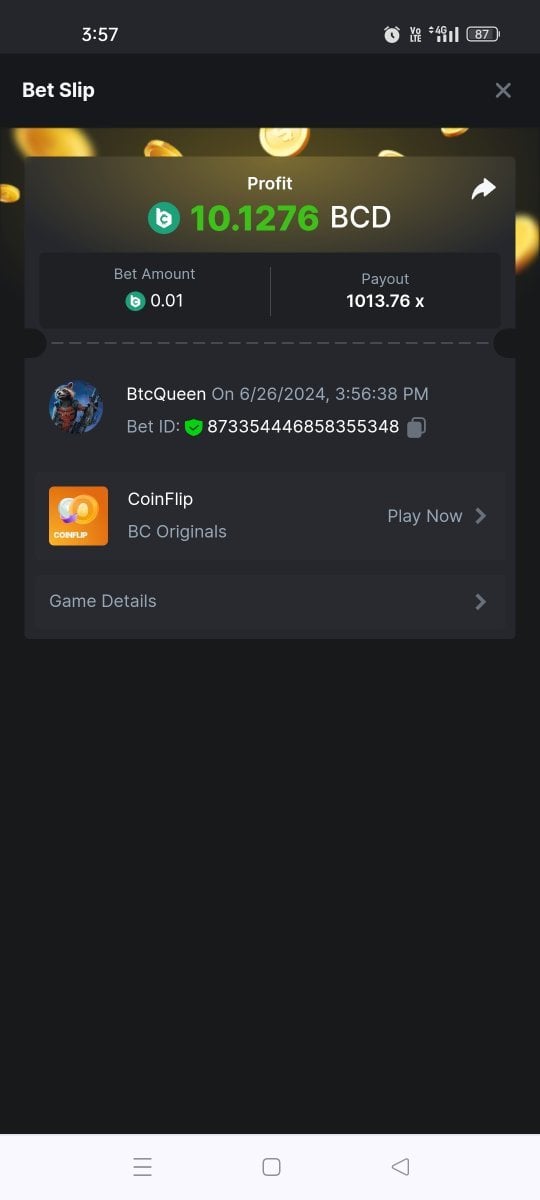 Moderator Giandreas Posted June 26, 2024 Moderator Share Posted June 26, 2024 Read Carefully Before Start To Hunt Forum Daily Challenges #643Hunt : CoinFlip Win the highest pay out Min Payout : series 5 Min Level 10️Duration Starting : Now End time : 23.59 UTC Time How to Join? Make screenshot + paste your bet link + UID or Profile link Any coin, with min bet 0.01 USD is allowed (jb/bb/bcl not allowed)Reward Prizes 1st Place.....$7 BCD 2nd Place.....$5 BCD 3rd Place.....$4 BCD 4th Place.....$3 BCD 5th Place.....$2 BCD 🏵 Winners will be announcing next day after Roll Point! 1 Link to comment Share on other sites More sharing options...
