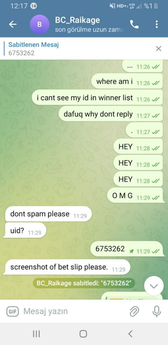 I won the "100x sword 10 winner 3bcd" event organized by @BC_Raikage by submitting my bet ID as 6th. @BC_Raikage congratulated me on completing it. and then forgot to add my id to the list. Even though I warned him, he did not add it and the event, which lasted another 20 minutes, was finally concluded. Even though I told him that my ID number was still not on the list, he did not add it and blocked me from Telegram and Global Chat to suppress his own mistake..
