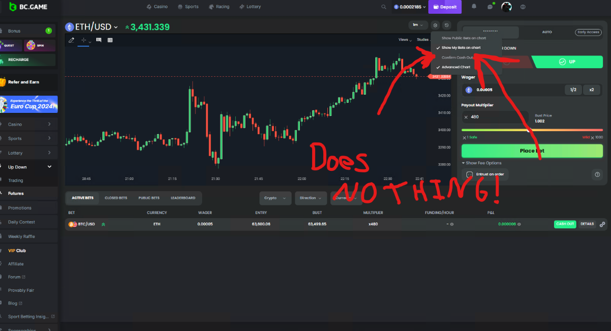 Xiotplliaile Posted July 22, 2024 Share Posted July 22, 2024 Under "Up/Down" then "Futures" the setting to disable having to press 'cash out' THEN another button to confirm it, does not work. The default ALWAYS should have been to cash out when I press 'cash out'. But if youre going to make me click a second button, the option to disable this REALLY needs to work. The idea that anyone would want a delay when the point is to profit off of small sudden price changes makes no sense. Link to comment Share on other sites More sharing options...