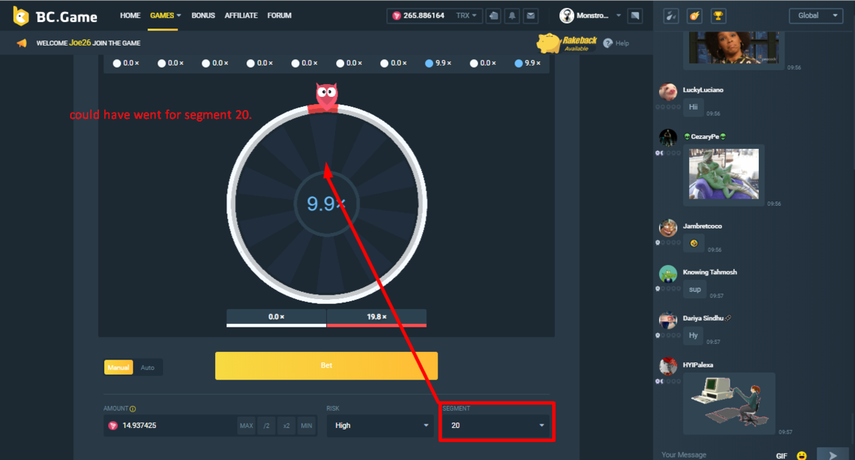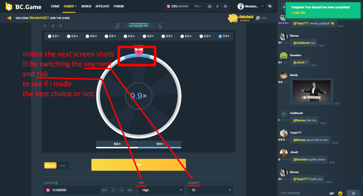 i started off playing this game on low risk and now i play it only on high risk. why? because i'm now only having to guess how deep into the segment is it going to stop when i hit my win. this changes the need to raise your bet to catch profit. instead i just change the segment to a higher number if i want a higher payout. and a lower segment if i sense its going to stop before the segment i'm currently betting for.  After a win or two i'll go back to minimum bet to race through the expected loss streaks and when i sense if its going to hit i'll raise my bet and then i'll contemplate if it will be a shallow 10 (stopping in the first half of the blue) or a deeper 10 (stopping past half way into the blue) if i decide its going to stop deeper, i will change to a higher segment.