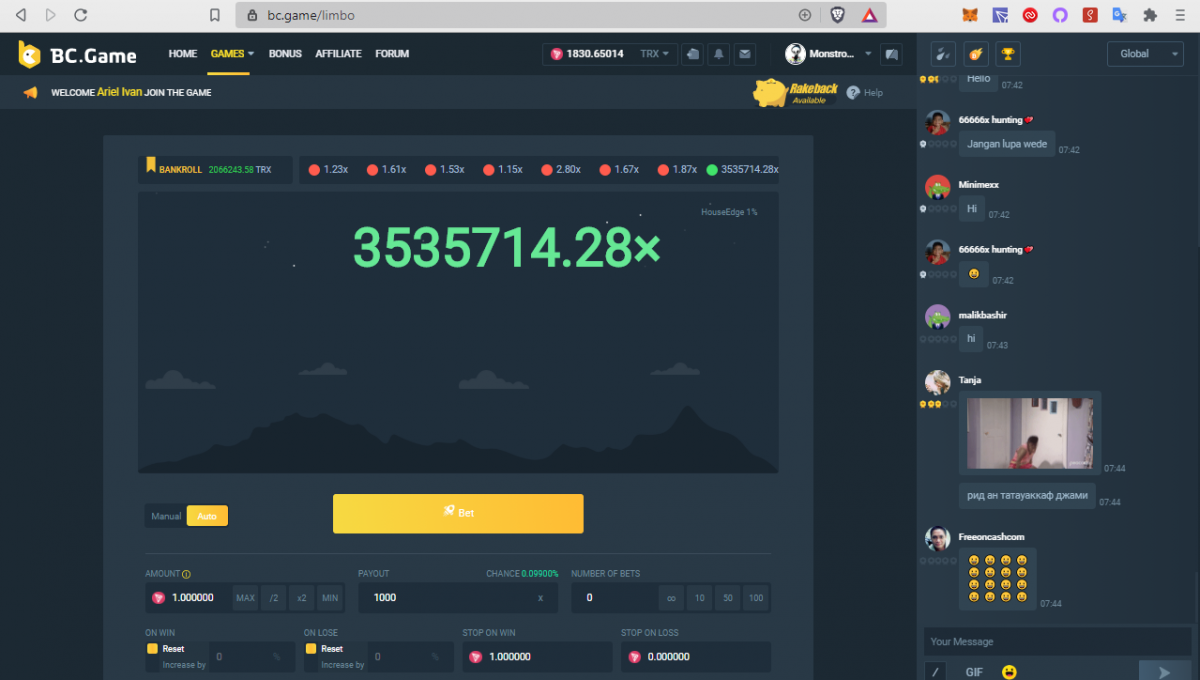 Monstrous Eberto Posted December 19, 2020 Author Share Posted December 19, 2020 On 11/3/2020 at 2:32 PM, CryptoCoyote said: I am in shock, I thought BC Game only went up to 9999x, this blew my mind, I just got my biggest multiplier win on Crash at 53.31x. I am going to be having Limbo dreams now, for a Lambo, lol. Way to go Monstrous Oberto, it must have been a huge blast to win that high a multiplier! I didnt win that. I was only going for 1000x's but just 20 bets or so before i was trying to hit 66666x and i changed just before it would have hit. Its a medal im trying to earn. You gotta hit a payout of 66666x your bet to earn it. And twice it slipped passed me when i decided to lower my risk payout. You should really try going for it. I love to chase big payouts. lets get that Lambo!! Thanks for the cheers, im not lowering my risk until i hit it again. So soon you'll see a successfull hit of 66666× my bet. Hopefully when betting bigger bets. Lol Link to comment Share on other sites More sharing options...