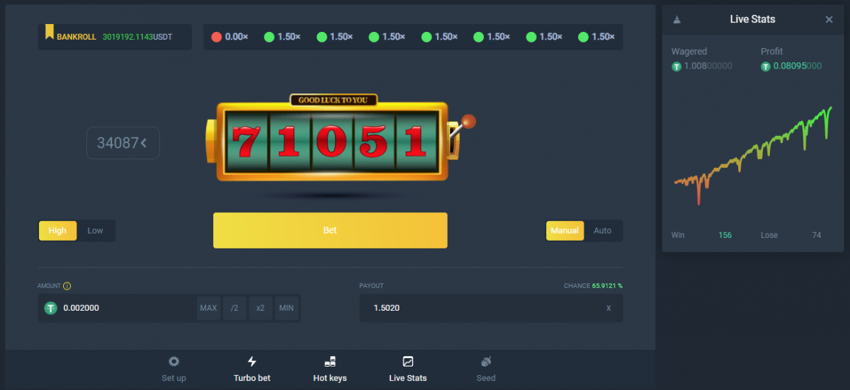 Zanja Posted October 13, 2020 Share Posted October 13, 2020 The past few days I've tested a strategy on Hash Dice. I've chosen 1.502 payout. 1. Chose your base bet - I've chosen 0.002 USDT 2. Roll 3. If win, then stay at basebet - if lose, then double basebet Basically everytime you lose, you double the bet. Everytime you win, bet half of your current bet until you reach the basebet. Don't go below your basebet, because this is were you will earn most of the time. I'm a psychology student from Sweden. I'm here to analyze your bad decisions. Link to comment Share on other sites More sharing options...