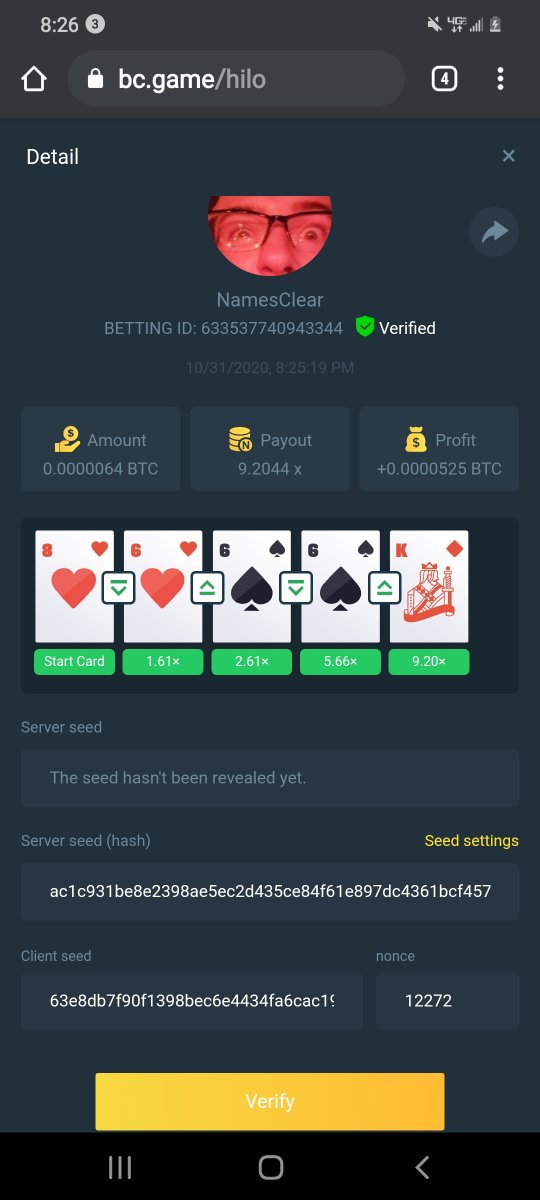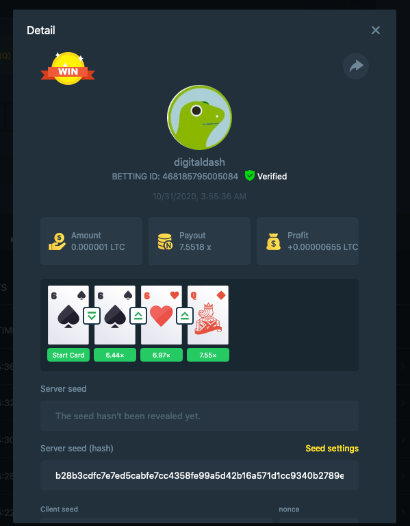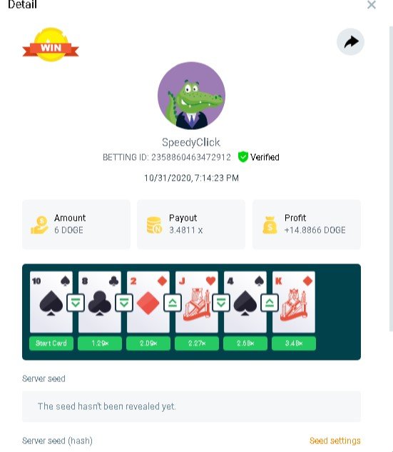 BCDash Posted October 31, 2020 Share Posted October 31, 2020 R U L E S + D E T A I L S The rules for this flash challenge are listed below, please pay close attention and make sure to read thoroughly. C H A L L E N G E O B J E C T I V E Get as many number 6 cards in a row as possible - skipping is allowed. Minimum of 3 in a row to qualify If you skip, only the 1st starting skipped 6 card counts. You must play the other ones in order for them to qualify. Should you skip and a 6 comes out after the 1st one, it doesn't count unless you actually bet hi/low on that card. Must be a WINNING bet, meaning you cashed out successfully. The Minimum bet amount to qualify is 100 sats (0.00000100 BTC) or equivalent. Bets submitted with less than 100 sats will not count towards a prize. Bets must have been made AFTER the start of the challenge. The player with the highest number of 6's in a row shall get top podium spot. In case of a tie, the one who placed a bet on their entry with a higher bet amount will be the winner. If still tied, whoever posted first will be deemed the winner. One (1) entry submission per household - anyone caught trying to use multi accounts for the promo will be banned from this challenge along with all future ones. Play fair. Challenge ends on 11/2/2020 - this thread will automatically lock once challenge is over. Check to see when the thread locks for the exact time of when it ends compared to your local time. How To Submit your Entry Take a screenshot displaying the round detail like so and send a reply to this thread with it: Must be able to see betting ID so that your bet can be verified. Please do not make multiple posts, just edit your original one if you need to replace with a better qualifier. PRIZE DISTRIBUTION For this particular flash challenge, we’ll be offering spots for 1st, 2nd and 3rd place. Prizes are as displayed below. We're also trying something new, 1st through 3rd place winners will receive prize winnings in your coin of choice! 1ST ....... $222 2ND ...... $111 3RD ....... $66 ...But wait, that's not all! Participants who post VALID ENTRIES for this challenge will split a prize pool of $267! -- Prizes will be paid directly to the winning accounts upon verification within 24 hours of challenge ending. We reserve the right to ask the player to select an alternate coin of choice if deemed necessary. Only valid entries that meet the challenge requirements will qualify for the prize pool, - bets must have been made after this challenge was created and must be placed with a minimum bet amount of 100 sats or equivalent. We reserve the right to deem a player ineligible for this challenge if they are banned from the site or were found to be attempting to manipulate it in any way. "Life is the biggest scam of all, because eventually you die." - digitaldash Link to comment Share on other sites More sharing options...