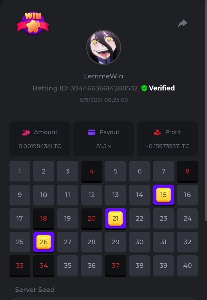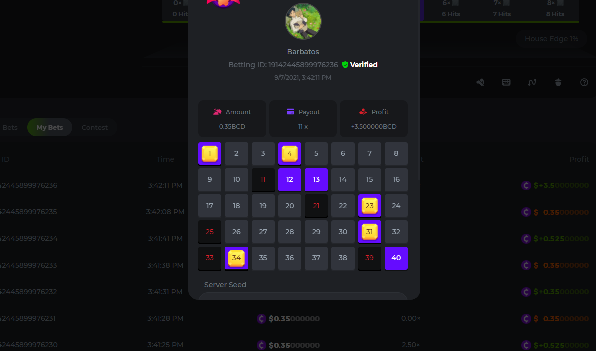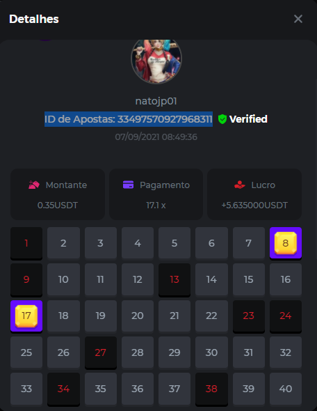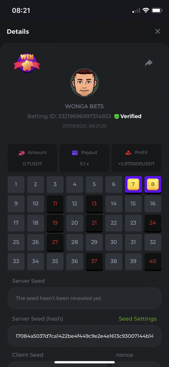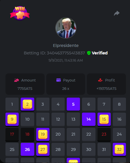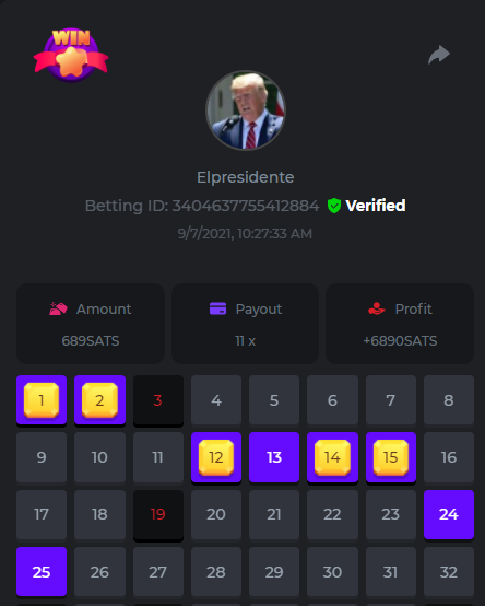 Mongthehung Posted September 7, 2021 Share Posted September 7, 2021 13 hours ago, digitaldash said: TOP TIER CHALLENGE #3 Starts: 06:00, September 7 GMTEnds: 06:00, September 14 GMT Welcome back! You may be wondering why this challenge is only $2,000. We'll be having two separate challenges going on this week, with the second part coming very soon so keep a lookout for that! This week, we have a KENO challenge! What's the Challenge? Complete as many of the following 20 payouts on either KENO Multiplayer or KENO Single Player. You must hit a MINIMUM of 5 of the payouts to qualify! 5.10x - 11x - 17.1x - 26x - 30x - 56x - 67x - 81.5x - 100x - 180x - 259x - 270x - 390x - 450x - 500x - 600x - 710x - 800x - 900x - 1000x Each payout you hit above counts as 1 point, with a maximum of 20 points. If there is a tie, the player with the higher total bet amount (in USD) shall be the winner. The payouts must be EXACT hits (56x and 50x are not the same) - if you can't find a payout, try changing the risk level to medium or high. Minimum VIP Tier Must be VIP10 or higher in order to enter this challenge. Minimum Bet Size $0.35 equivalent (please check the individual coin amounts below) Eligible Coins All coins are eligible (excluding JB) Available Prizes 1st Place......$500 2nd Place.....$375 3rd Place.....$250 4th Place......$125 5th-25th......$25 Participation Pool.......$250 split equally How to Enter To enter, copy the bet ID of the bet you'd like to submit Once you've copied it, post it as a reply to this thread like so: Betting ID: 1708854428417660423 In the same post, upload a screenshot of your win by clicking the game ID WITH VIEW IN USD mode ENABLED (accessible at the bottom of dropdown menu for your wallet up top. This way, we can ensure that your bet indeed met the minimum requirement at the time of placing it: Please combine all of your hits together in a SINGLE post. Edit, don't create a new post. Bets must be posted within 24 hours of placing bet in order to keep things fair for everyone. Bets must be made during the specified time windows stated above. This thread will lock automatically when the time period is over. One (1) entry per household. Anyone found to be attempting to win multiple prizes will be disqualified from this challenge as well as all future challenges. Furthermore, you will go on the WALL OF SHAME for all to see that you are a scam! Failure to follow instructions will result in your submission being null and void. And let the races begin! Good luck everyone, look forward to seeing who comes out on top this week Link to comment Share on other sites More sharing options...