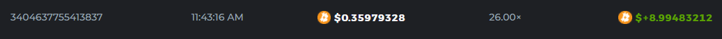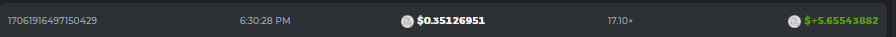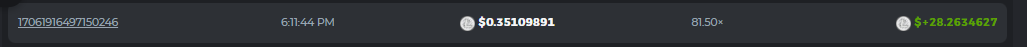 bassabar Posted September 7, 2021 Share Posted September 7, 2021 total: 12 points Total betamount: 5,97$ (0,50$ average) Multiplyer: 5.1x Betid: 14766978032043776 Betamount: 2,00$ LTC to dollar: Multiplyer: 11x Betid: 14766978032044206 Betamount: 0,36$ Multiplyer: 17.1 Betid: 14766978032044245 Betamount: 0,36$ Multiplyer: 26x Betid: 14766978032044240 Betamount: 0,36$ Multiplyer: 30x Betid: 14766978032044337 Betamount: 0,36$ Multiplyer: 56x Betid: 14766978032046020 Betamount: 0,36$ Multiplyer: 67x Betid: 14766978032044453 Betamount: 0,36$ Multiplyer: 81.5x Betid: 14766978032046063 Betamount: 0,36$ Multiplyer: 100x Betid: 14766978032050445 Betamount: 0,404$ LTC to dollar: Multiplyer: 180x Betid: 14766978032050479 Betamount: 0,36$ LTC to dollar: Multiplyer: 259x Betid: 14766978032051052 Betamount: 0,37$ LTC to dollar: Multiplyer: 270x Betid: 14766978032052857 Betamount: 0,36$ LTC to dollar: Link to comment Share on other sites More sharing options...
